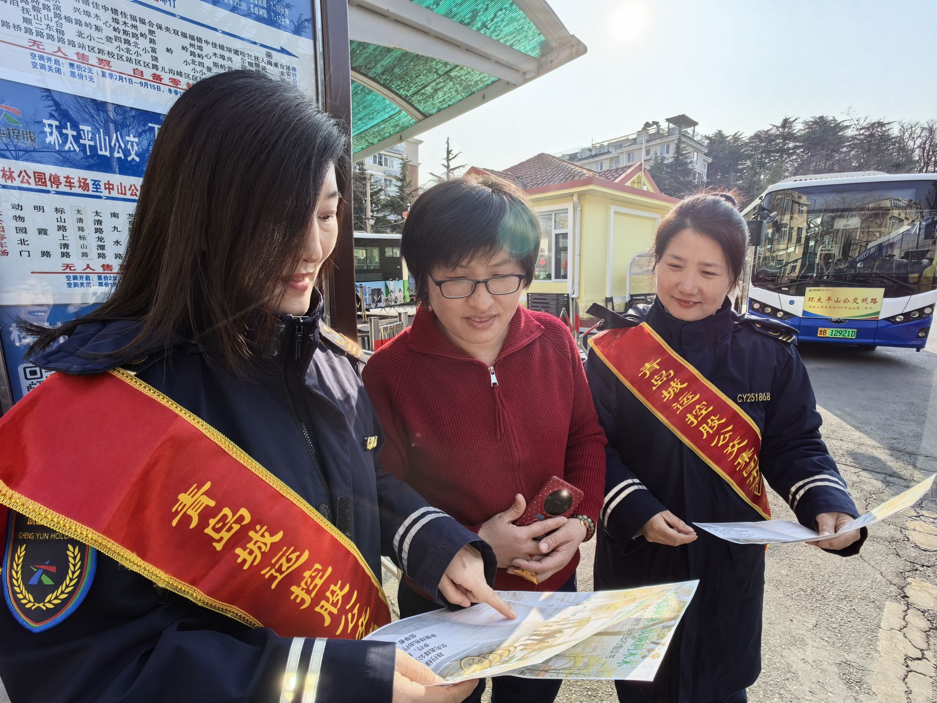 除了将绿色搬进车厢,市南巴士五分公司还将服务延伸至街头。志愿者们走上人流密集的公交站点,向市民发放绿色出行宣传单页,耐心讲解优先选择公交、骑行、步行等低碳出行方式的益处,引导大家树立“少开一天车、多乘一次公交”的环保意识,用实际行动守护岛城的蓝天。