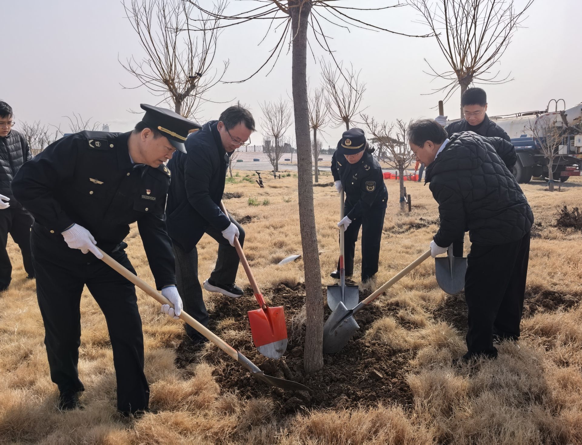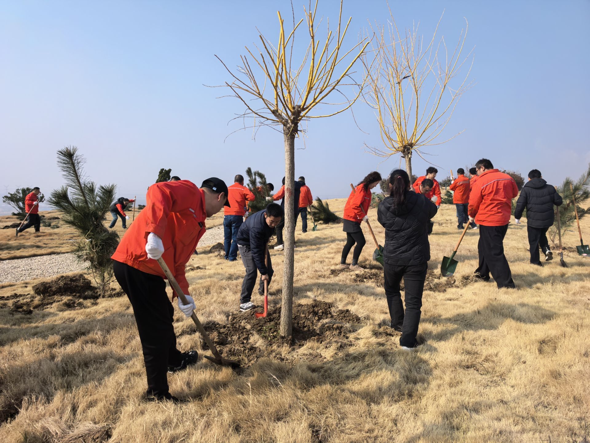 植树现场,党员志愿者们在专业人员指导下分工协作、默契配合,挥锹铲土、扶苗定植、填土浇水,道道工序严谨细致。众人满怀热情、干劲十足,经过近一小时通力协作,一百余棵新苗迎风挺立在山顶公园,为生态修复基地增添盎然新绿。