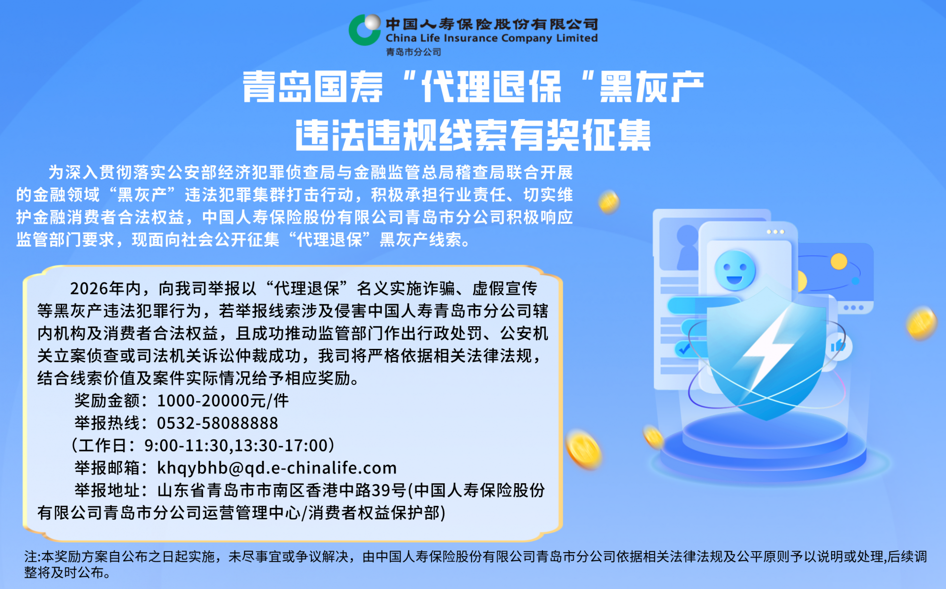 为深入贯彻落实公安部经济犯罪侦查局与金融监管总局稽查局联合开展的金融领域“黑灰产”违法犯罪集群打击行动,积极承担行业责任、切实维护金融消费者合法权益,中国人寿保险股份有限公司青岛市分公司(以下简称“青岛国寿”)现面向社会公开征集“代理退保”黑灰产线索,充分调动社会力量,广泛征集违法违规线索,全力维护金融市场稳定与安全。