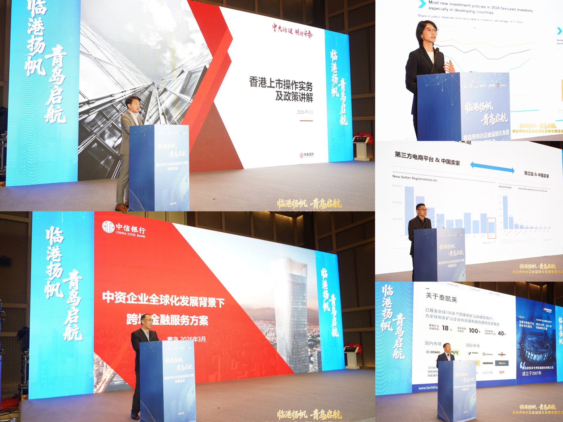 中泰证券股份有限公司董事、总经理冯艺东围绕资本市场赋能中小企业出海做分享,表示中泰证券将立足青岛中小企业全球化发展需求,当好企业出海的“金融伙伴”和“坚实后盾”。中信银行股份有限公司青岛分行党委委员、副行长吴从勇解读跨境金融服务如何护航企业时,强调中信银行将持续构建“精准滴灌、高效赋能、专业护航”的金融支持体系,助力青岛企业拓展海外市场、迈向国际舞台。