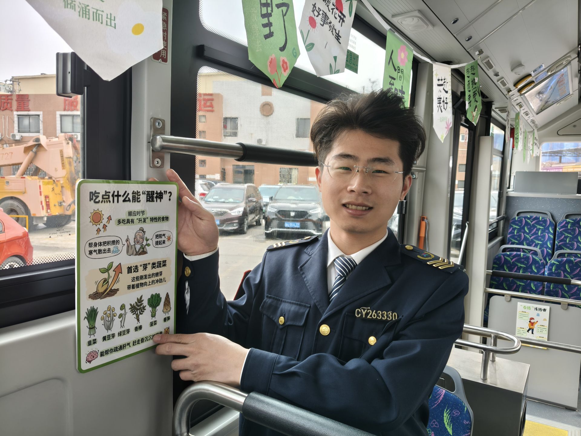 此外,驾驶员袁士宝在扶杆一侧悬挂了多张养生汤菜谱手账贴,图文并茂、简洁实用,乘客可随手取用,将健康食谱带回家中。车厢内还张贴了多组春季养生科普展板,以通俗易懂的图文结合形式,清晰解读“春捂”四大原则、春季困意成因及提神饮食建议等实用内容,帮助乘客科学应对春季气候变化,树立正确的养生观念。