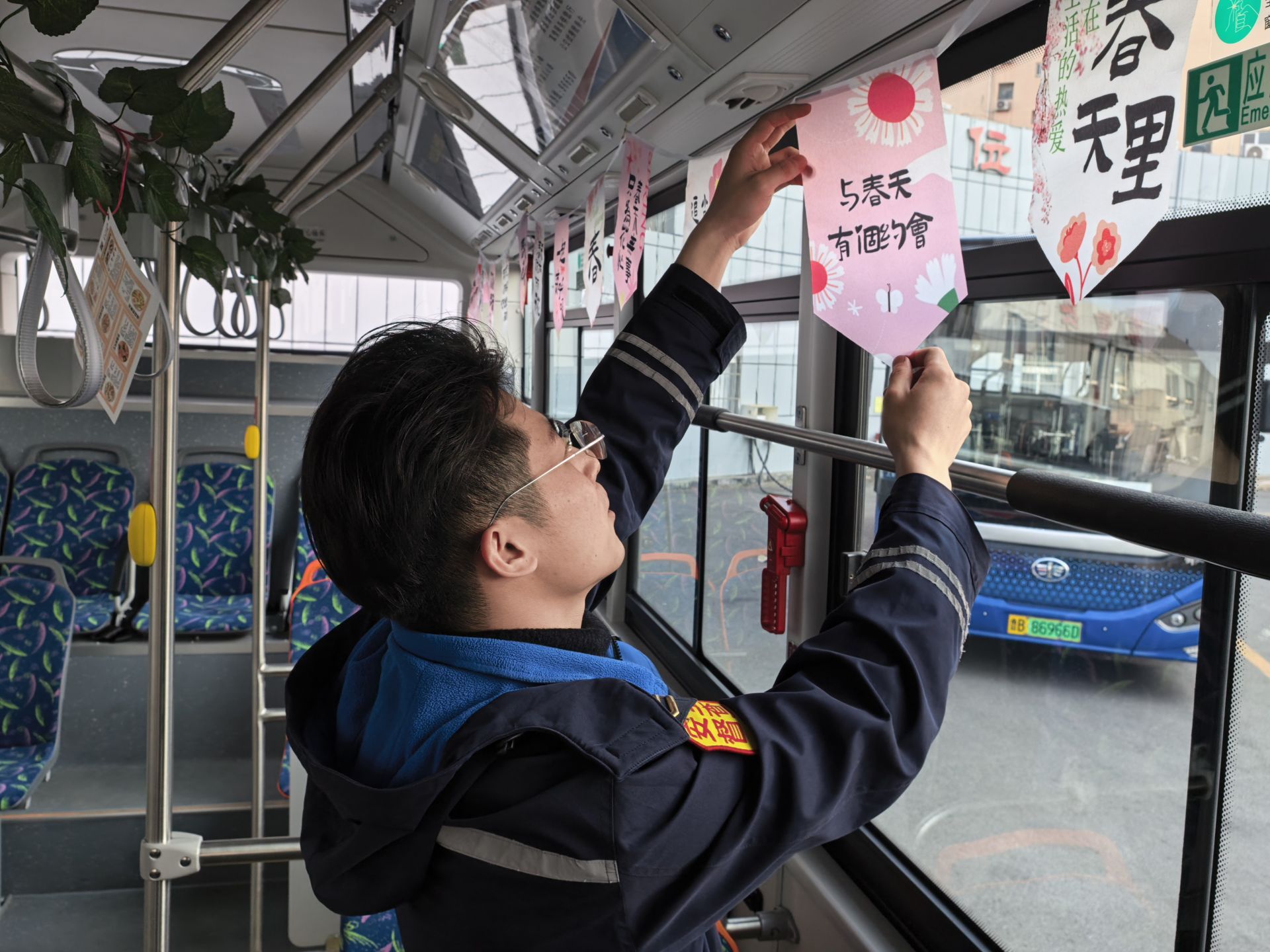 记者步入216路线DD2554号车主题车厢,清新绿色氛围扑面而来。扶手杆上缠绕仿真绿色枝叶,模拟春日草木生机,瞬间驱散乘客的疲惫感。车窗上部悬挂着印有“春日”标语的小彩旗,在微风中轻轻摇曳,营造出舒适温馨的乘车环境,让每一次出行都充满春日仪式感。