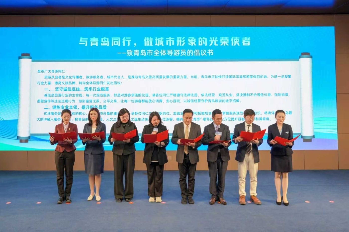 行业传承与榜样引领成为本次活动的重要篇章。活动特别设置行业致敬环节,向全国模范导游、国家特级导游孙树伟,全国优秀导游、国家高级导游李莉,全国金牌导游、国家高级导游阎妮、段岩四位行业标杆致以敬意,彰显了青岛导游行业代代相传的职业坚守。现场同步举行青岛市文旅“推介官”“观察员”聘任仪式,历届大赛优秀选手代表受聘为文旅推介官,四位行业标杆受聘为文旅观察员,共同构建起“传帮带”的人才培育体系。随后,推介官与观察员联合宣读《与青岛同行,做城市形象的光荣使者》行业倡议书,发出坚守诚信底线、锤炼专业本领、倡导文明旅游三大核心倡议,为行业高质量发展立下庄严约定。