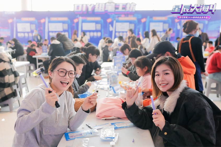 在发布会开始前数小时,点石打造的“制笔节”互动体验区,将DIY组笔工坊、文创体验与科技展示融为一体。亲子家庭、年轻朋友在此沉浸其中,亲手挑选笔杆、笔芯、弹簧等部件,组装出独一无二的笔。这种深度互动体验,将一次性消费行为,转化为可参与、可感知、可分享的情感记忆,构建了“即看即触即购”的新消费场景。