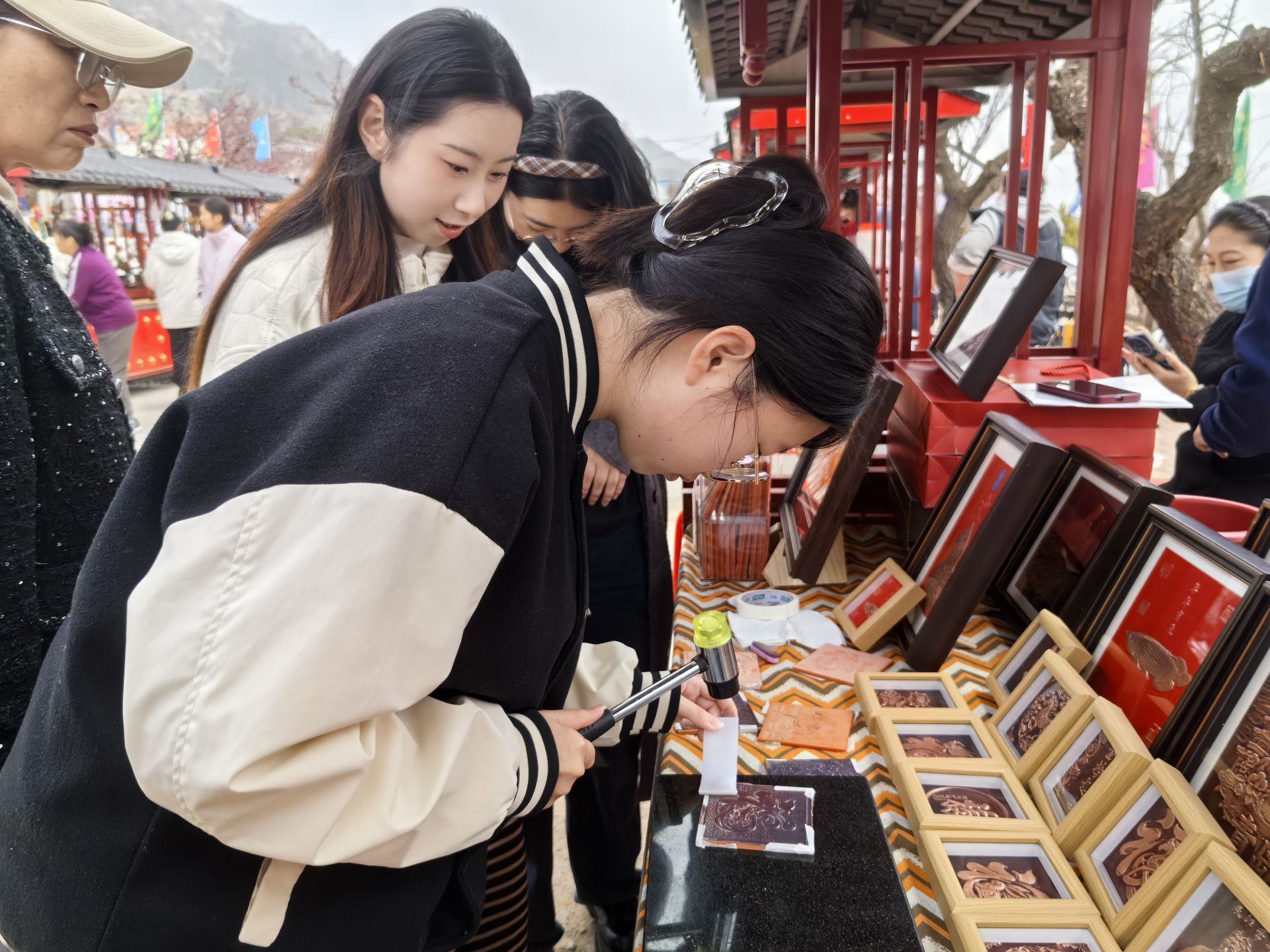 花开古村落,马跃振兴路。本届毛家山“飞花市集”设置了“赏、玩、购、读、演”五大板块。在毛家山“非遗一条街”,琅琊铜拓、剪纸、葫芦烙画、螺钿等非遗传承人现场展演绝活,游客们亲手体验拓片、螺钿制作,感受“非遗+研学”的魅力。