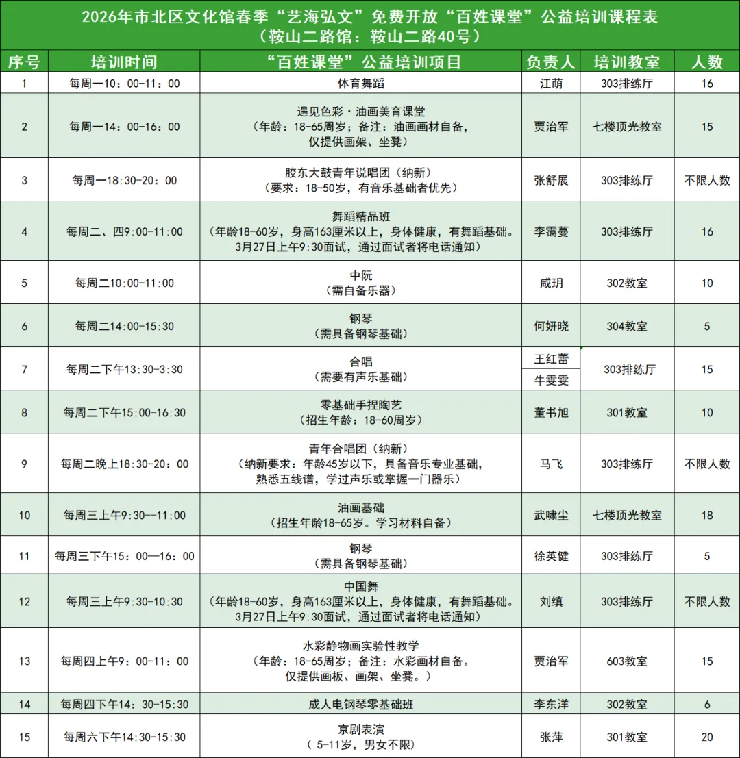 具体课程信息请参照下方课程一览表,报名请关注“市北区文化和旅游局”公众号查看。