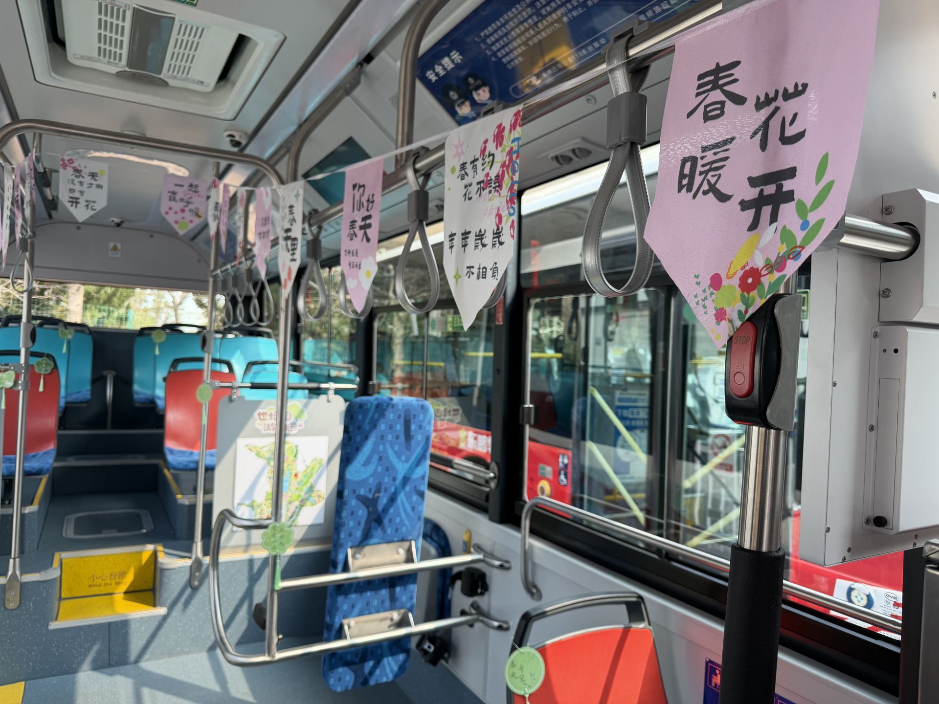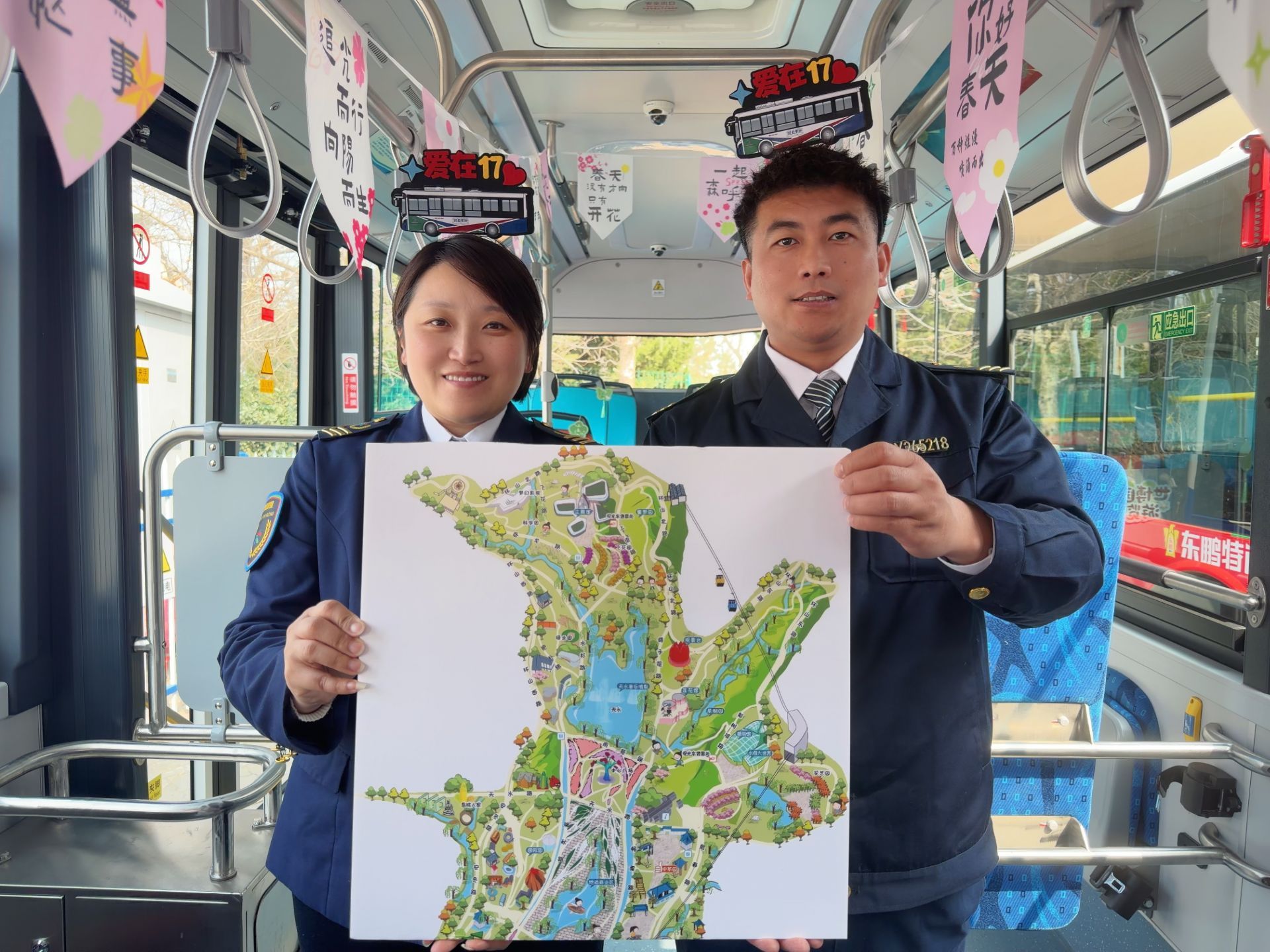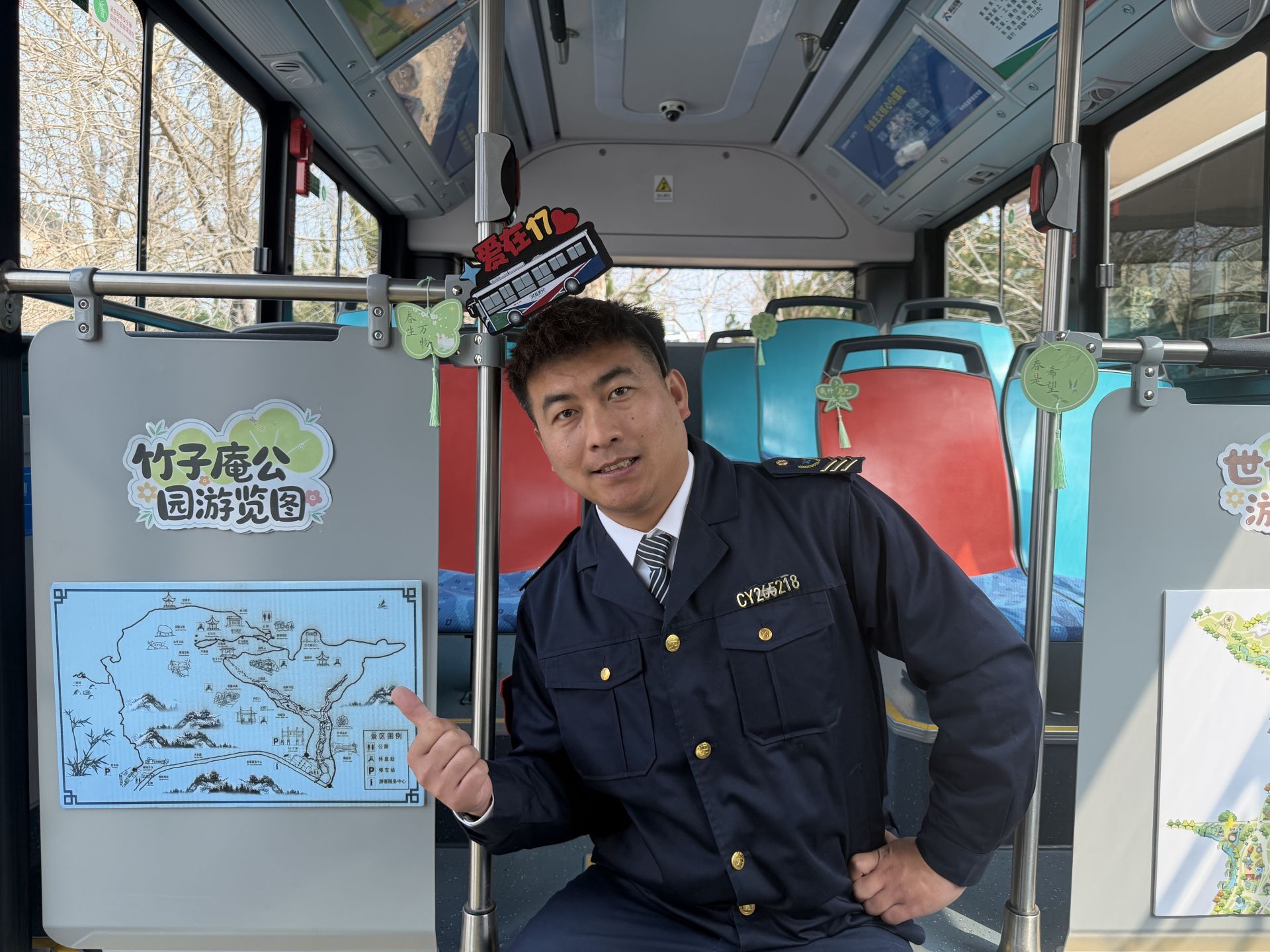为了让乘客精准把握游玩节奏,17路车厢内特别定制张贴了竹子庵公园和世博园的专属游览图,清晰标注景点特色、游览路线、最佳拍照点及周边服务设施。乘客无需提前做攻略,只需抬头看车厢,就能轻松规划行程。同时,驾驶员张晓在车厢内悬挂了春日主题挂旗,搭配绿叶、风筝等元素装饰,印有“最是一年春好处”“春生万物”“遇见春天”等温馨话语,让每一处细节都流淌着春日气息,实现“车在景中走,人在画中游”的沉浸式体验。