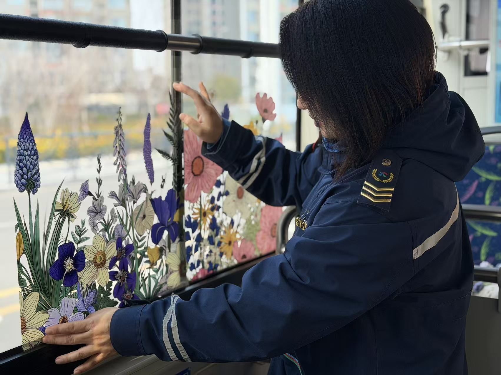 “一上车就感觉春天扑面而来,心情一下子变好了!”近日,不少乘坐208路公交车的乘客惊喜地发现,车厢内焕然一新——车窗上张贴着燕儿岛山公园的春日美景贴纸,嫩绿的枝叶与绽放的花朵交织,扶手边点缀着清新的仿真花艺。乘客们纷纷举起手机拍照留念。有市民感慨地说:“坐个公交车都能出片,这大概是青岛春天独有的仪式感吧。”这份春日惊喜出自208路驾驶员周雅琪之手。开春以来,随着气温回升,前往燕儿岛山公园踏青赏景的市民络绎不绝。