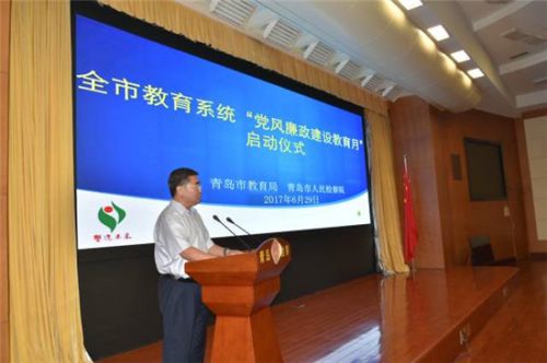 大众网青岛6月29日讯(记者 金红蕾 曲顺)2017年6月29日上午,全市教育系统“党风廉政建设教育月”活动启动仪式在市人民检察院举行。这次活动是纪念中国共产党成立96周年开展的系列主题活动之一,也是省、市党代会召开后,在全市教育系统开展的首次廉政教育活动。市委常委、市委高校工委书记、市教育局党委书记、局长邓云锋出席会议并讲话。市人民检察院有关领导、市教育局领导班子成员、机关各行政事业处室主要负责人、各区、市教育(体)局书记、局长以及局属学校书记、校长共计110余人参加了会议。启动仪式上,发放了市教育局与市人民检察院联合编写的《全国教育系统部分违法违纪警示教育案例选编》,市人民检察院宣讲团成员作了警示教育报告,参观了市人民检察院预防职务犯罪专题展览。