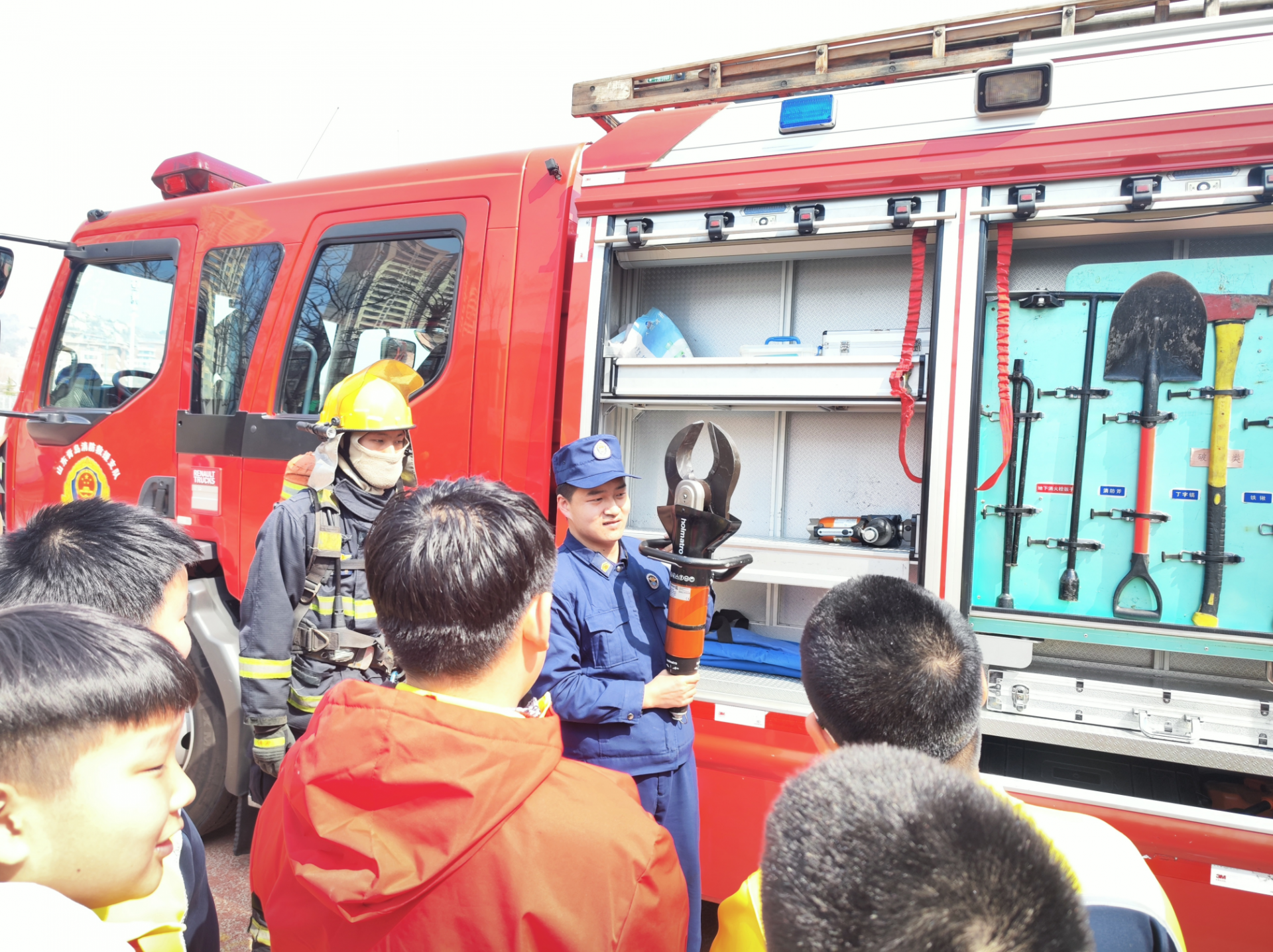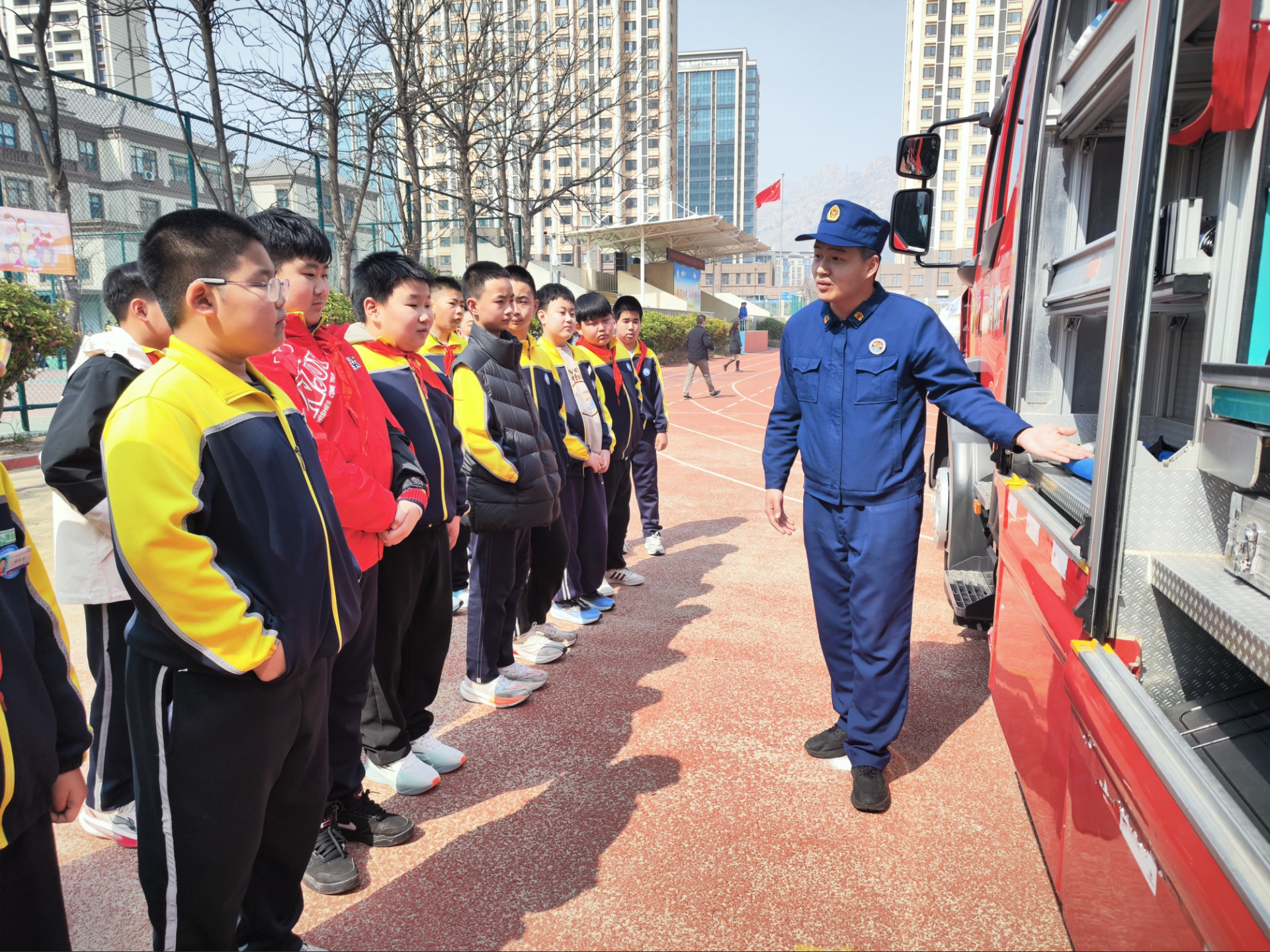 当天,黄岛区消防救援局宣传员为师生们上了一堂“沉浸式”消防安全实践课。结合校园实际,宣讲人员用通俗易懂的语言,讲解了火灾预防、初期火灾扑救、应急疏散逃生等常识,引导学生们在日常生活中养成良好安全习惯,增强自我保护意识。在消防车辆展示环节,学生们近距离参观各类消防救援车辆和随车器材,指战员逐一介绍不同装备的功能用途。面对一件件“硬核”装备,孩子们不时发出惊叹,现场气氛热烈。