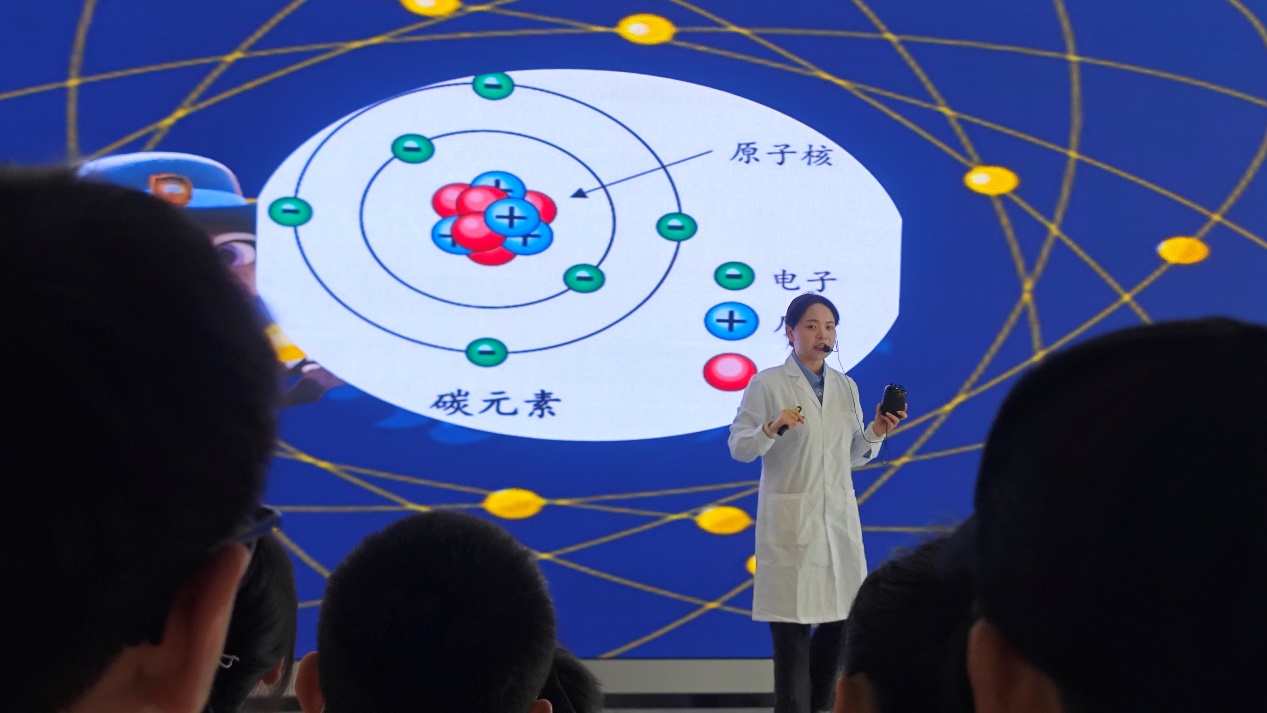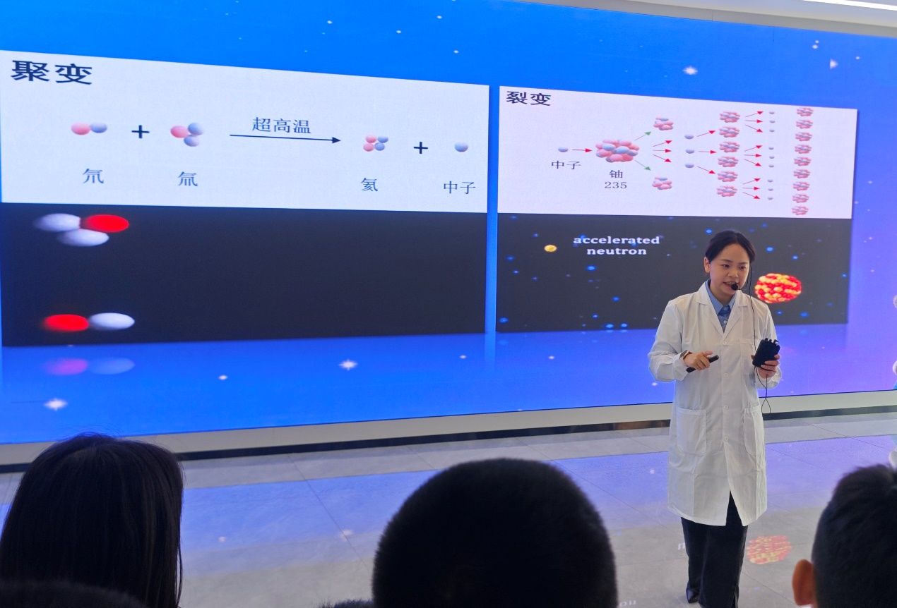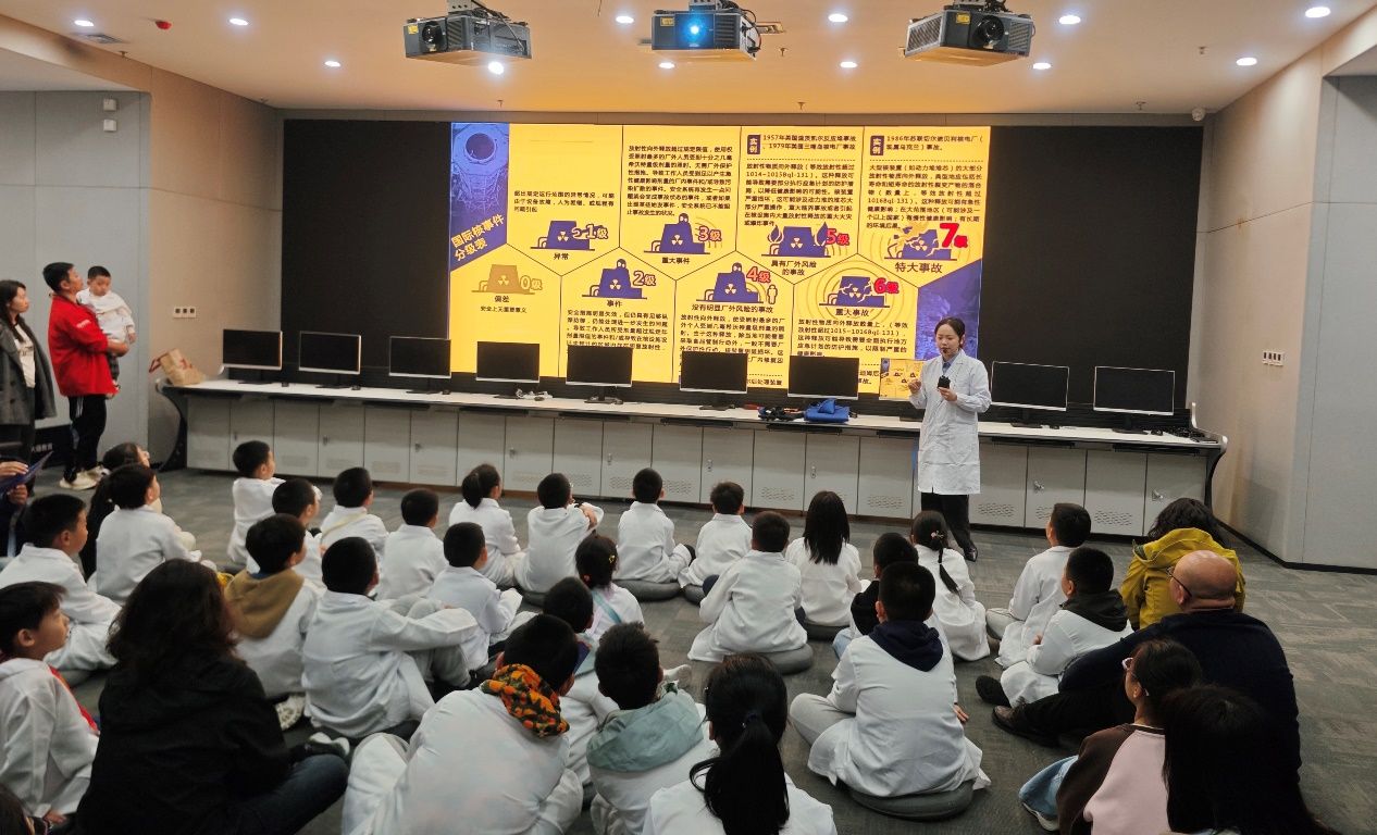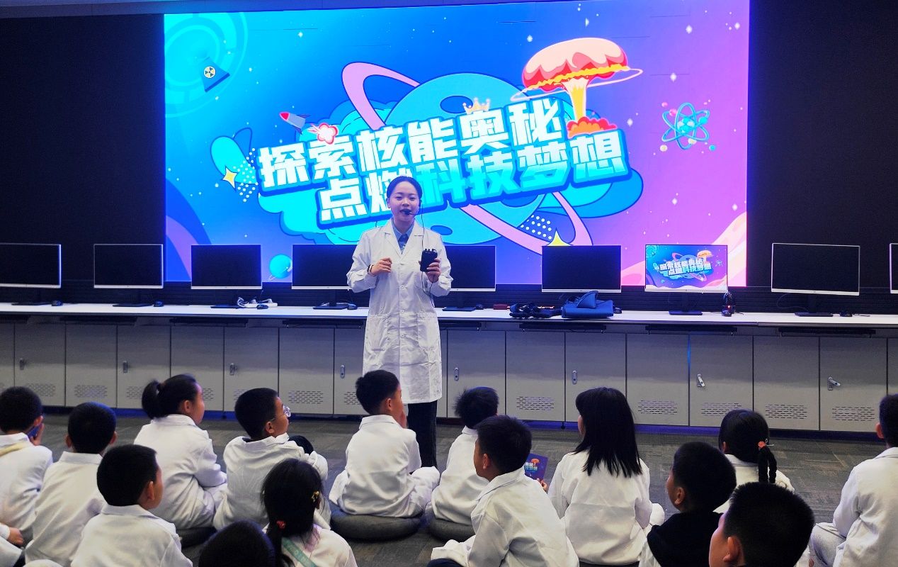活动伊始,身着统一研学服的小记者们在研究院大厅举行了庄严的“小小科学家”宣誓仪式,铿锵的誓言让孩子们树立起对科学探索的敬畏与向往,也为本次研学拉开了序幕。在随后的核能科普环节,研究院的琪琪老师用通俗易懂的语言为小记者们讲解原子结构、中子特性等基础知识点,通过“一滴水含有50万亿个原子”的形象对比,让孩子们直观理解微观世界的奥秘。