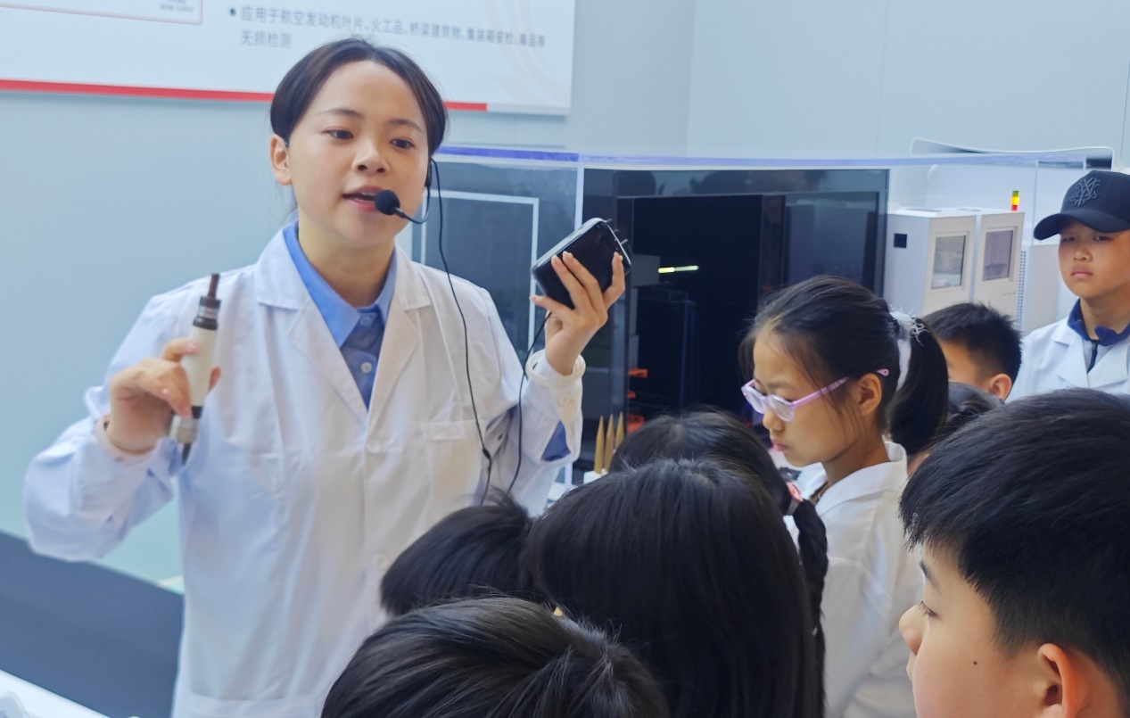 在科研设备展厅,小记者们驻足参观,近距离了解我国在中子领域取得的世界领先成就。展厅内,三项世界第一的科学装置成为研学焦点,讲师详细介绍了一秒钟能产生13万亿个中子的大型中子产生装置、精准治疗癌症的中子刀、检测设备内部结构的中子照相机以及助力油气勘探的小型中子源。其中,中子刀通过靶向药物结合中子射线定点杀死癌细胞的原理,中子照相机比X射线更清晰的成像优势,让小记者们惊叹不已。大家还了解到核电宝、太空核电源等前沿技术,知晓了小型化、模块化核反应堆在城市供电、深空探索中的重要意义,深刻认识到核能不仅服务于当下,更关乎人类未来的发展。