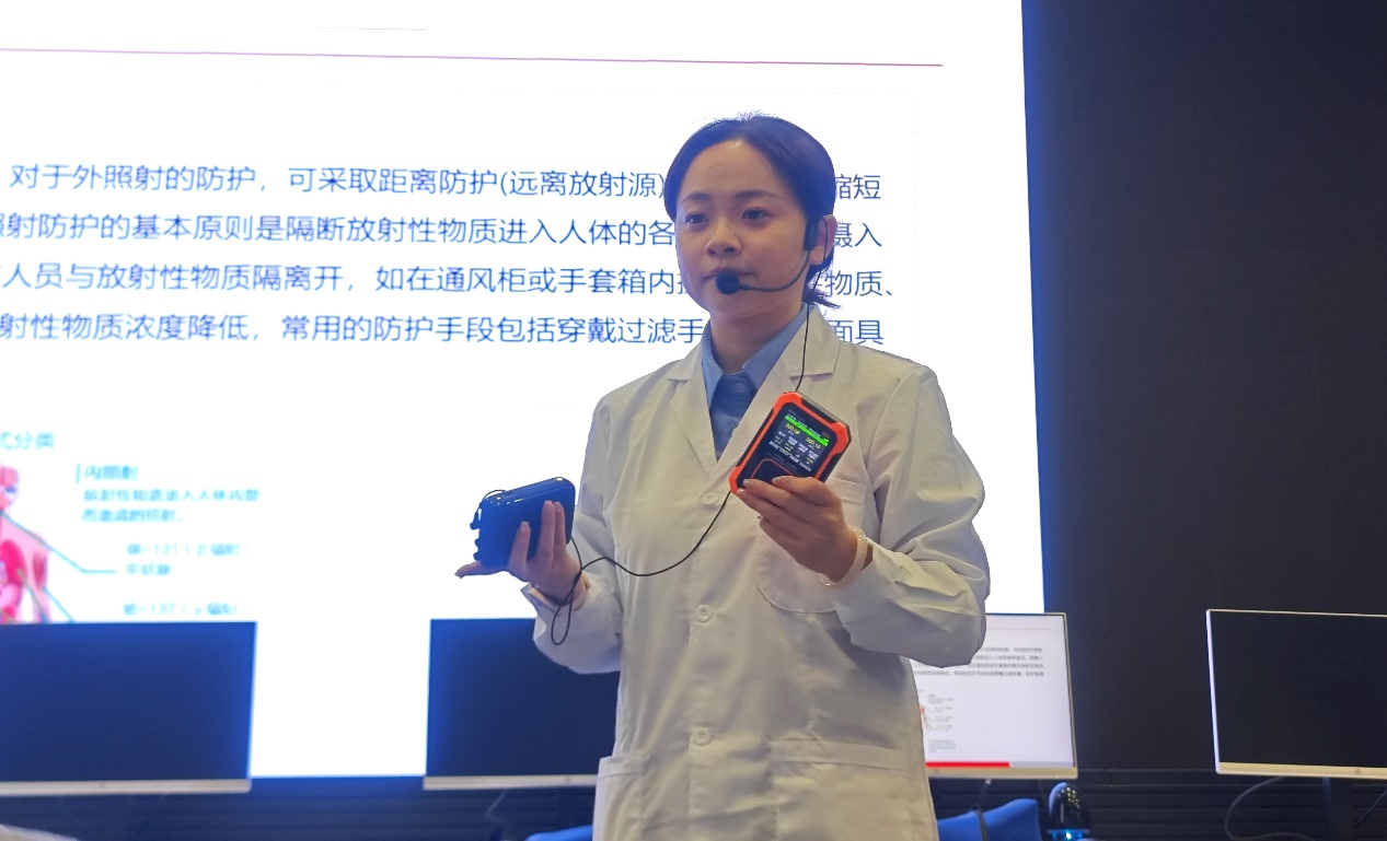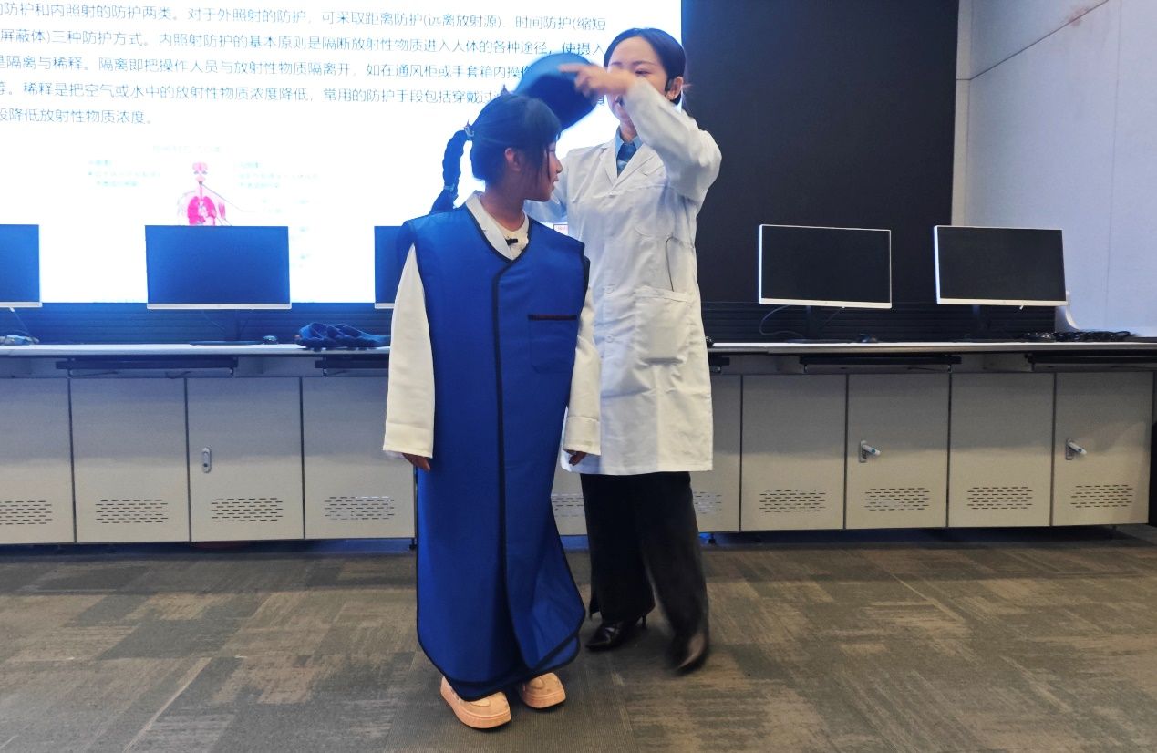 核设计与应急仿真实验室里,研学重点转向核电安全与辐射防护知识。通过卫星地图、历史影像剖析事故成因与危害,用“烧开水”的通俗比喻讲解核能发电的基本原理。为消除孩子们对辐射的知识误解,琪琪老师对比了日常生活中的辐射量:一次胸透0.02毫西弗、北京到欧洲往返飞机0.04毫西弗,而每天抽20支烟的年辐射量更是核电站的5倍,用真实数据让小记者们建立科学的辐射认知。在辐射防护体验环节,小记者们试穿专业辐射防护服,在工作人员指导下操作盖格计数器检测低剂量辐射源,全程在绝对安全的环境中感受辐射检测的过程,收获满满。