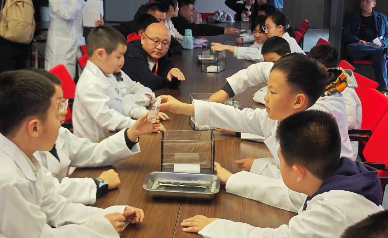 最后的实验是本次研学的独家亮点,小记者们分组体验了复刻100年前诺奖的威尔逊云室实验。在关闭灯光的实验室里,孩子们亲眼看到辐射源发出的α射线形成的粒子轨迹,直观地感受到微观世界的奥妙。分组操作的形式让每位小记者都能参与其中,大家在惊叹科学神奇的同时,也锻炼了动手能力与团队协作能力。