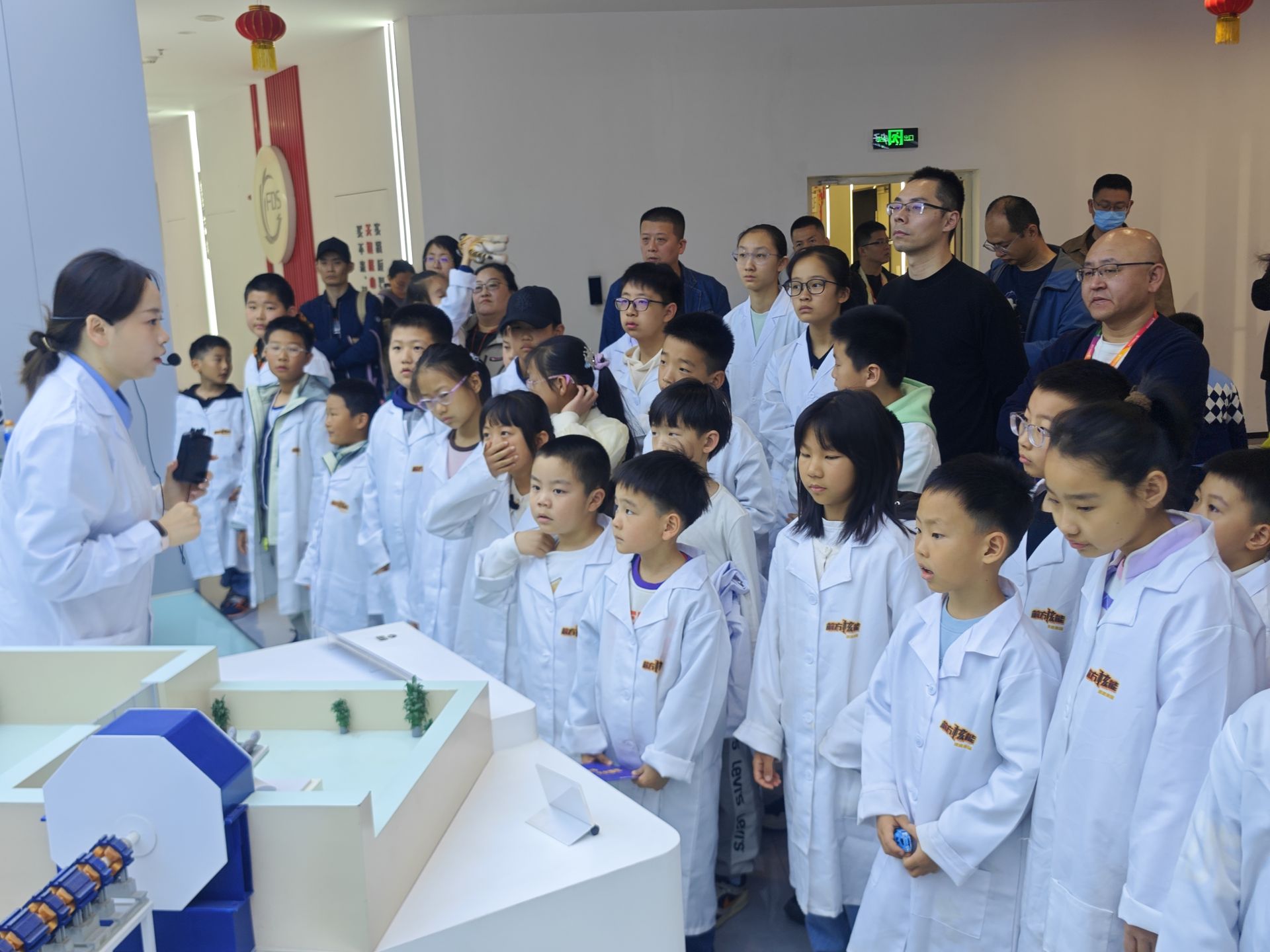 小记者参观科研设备展厅。
