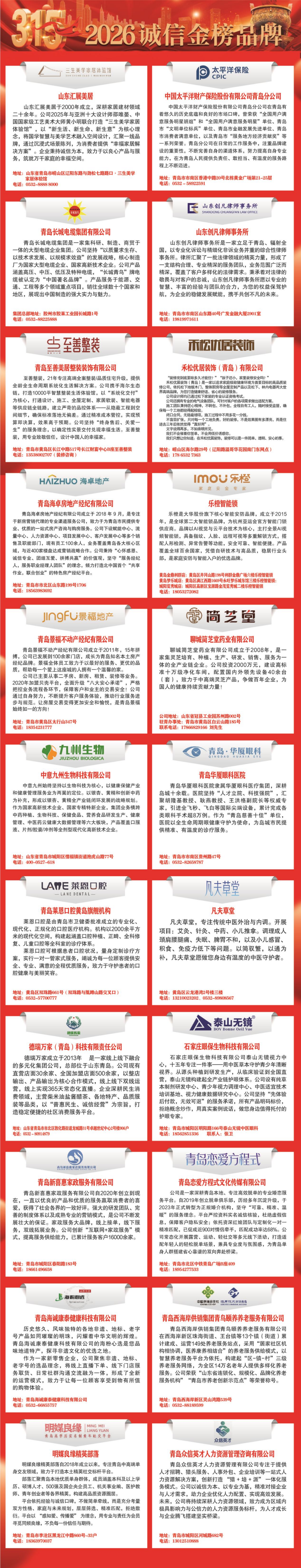 为弘扬社会诚信经营环境,日前,由青岛电视台主办的2026年度“诚信金榜”品牌名单正式发布,22个品牌成功入围。