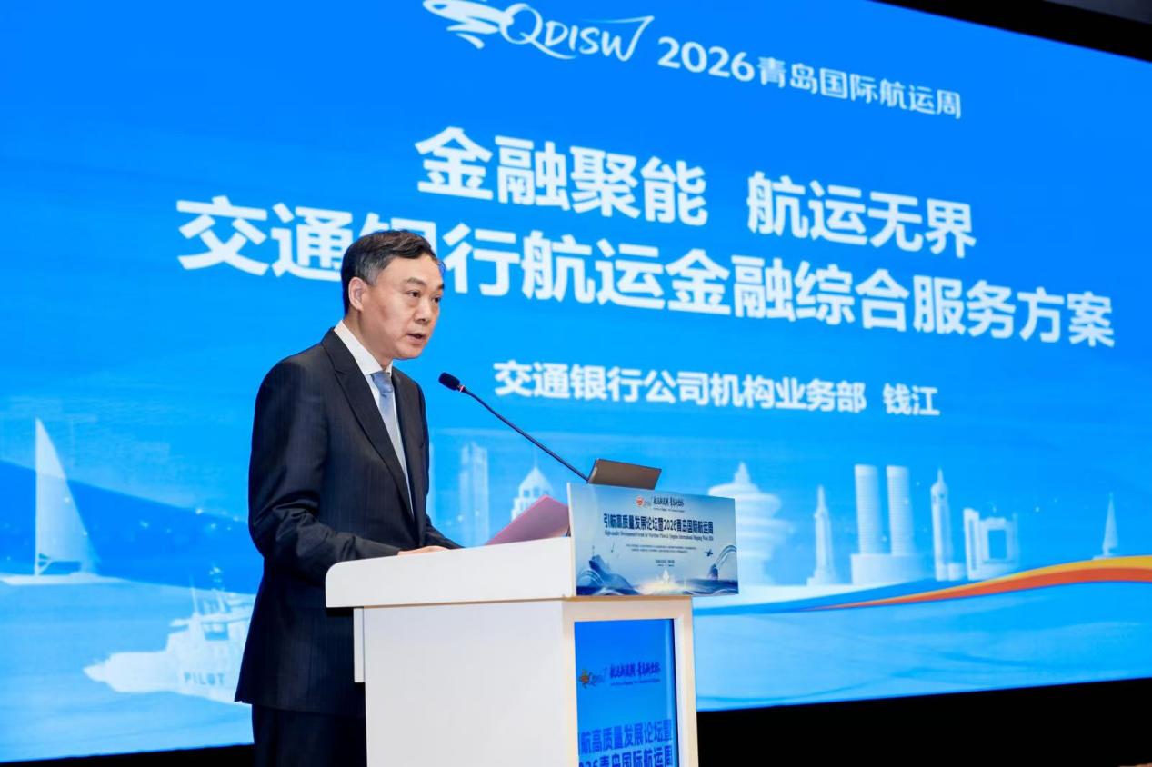为推动实施《青岛国际航运中心建设中期规划和2035年远景目标》,“2026青岛国际航运周”于3月30日正式启幕。本次活动以市场化形式打造集论坛研讨、创新发布、经贸对接于一体的高水平交流平台。在开幕式上,交通银行总行公司机构业务部副总经理钱江发表主题演讲,重磅发布《金融聚能 航运无界——交通银行航运金融综合服务方案》,以金融之力赋能青岛国际航运中心建设。