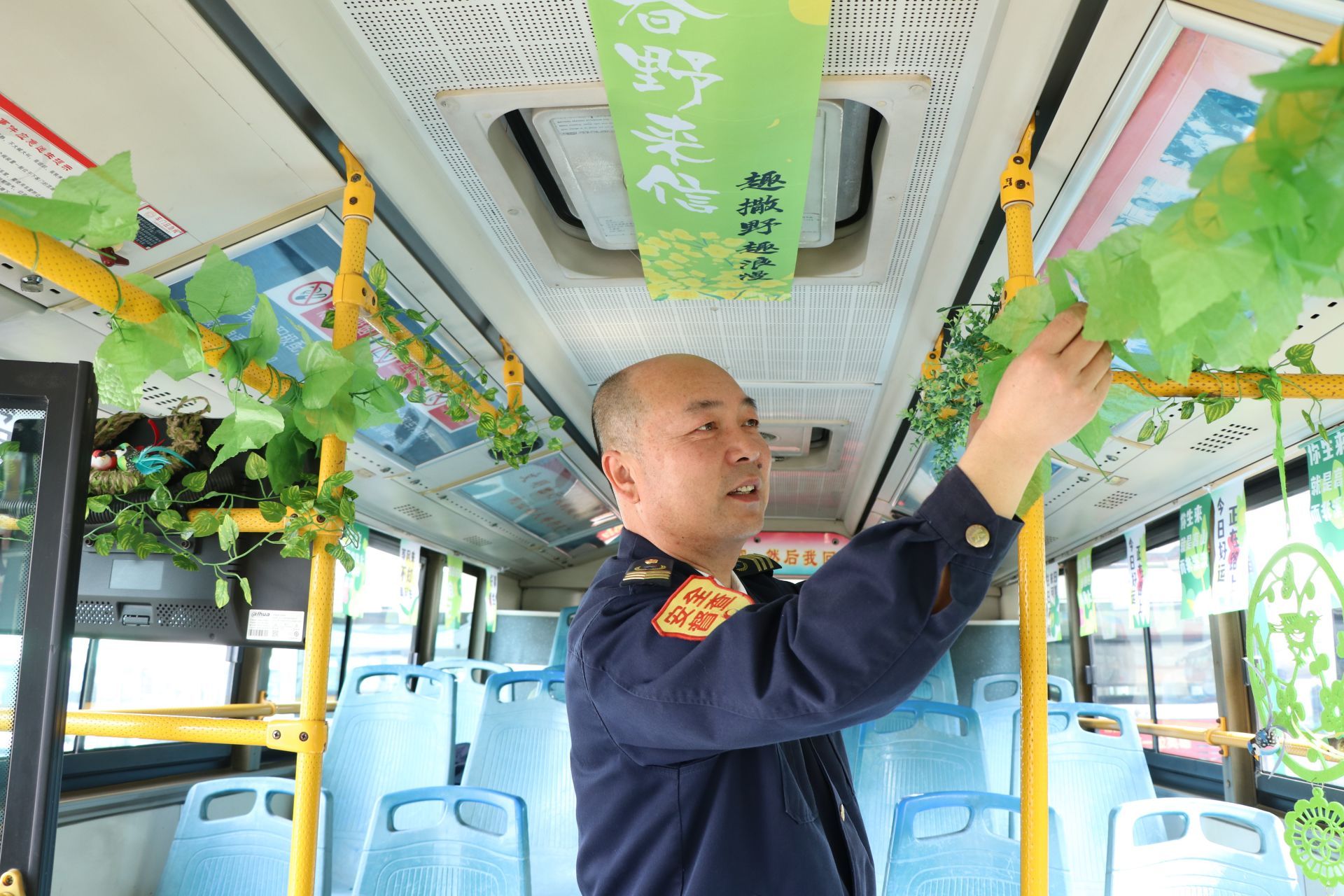 走进419路DD216号车,扑面而来的是盎然春意。王强精心布置了“春日踏青”主题车厢,以柳叶藤蔓缠绕装饰,点缀灵动燕子毛毡,小鸟窝与镂空春意挂画相映成趣,整个车厢宛如一座移动的“春园”,让乘客在行车途中提前沉浸于春游的美好氛围。