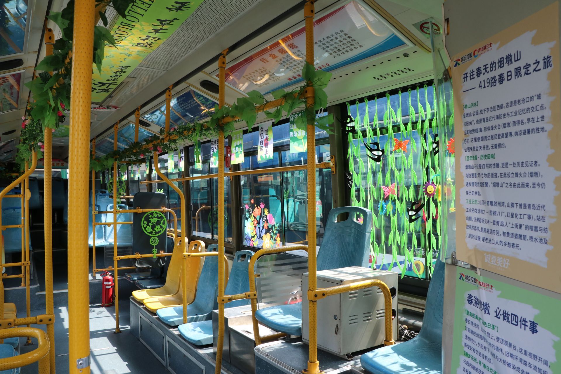 主题车厢不仅装饰别致,更在服务上全面升级。驾驶室旁增设“春游烟墩必做四件事”“开往春天的烟墩山”公园介绍及“乘车指南”三块展板,清晰呈现出行路线与便民举措,方便乘客一上车便掌握出游全攻略。“乘坐419路公交车,在汾阳路浏阳路站下车,往西步行约50米,就可到达烟墩山公园的上山入口。”王强介绍道,展板中详细标注了乘车线路与便民服务,为乘客出行提供清晰指引。