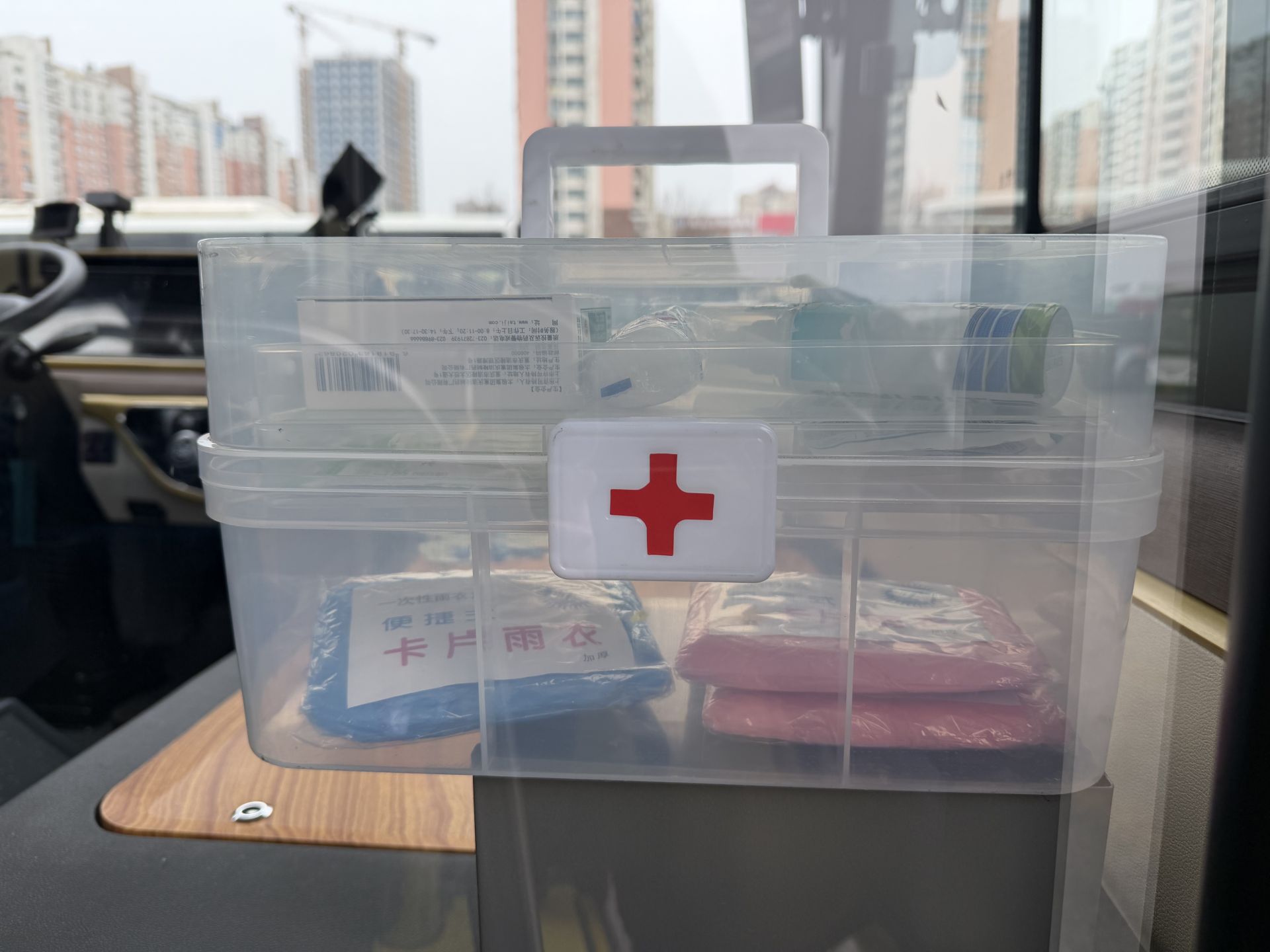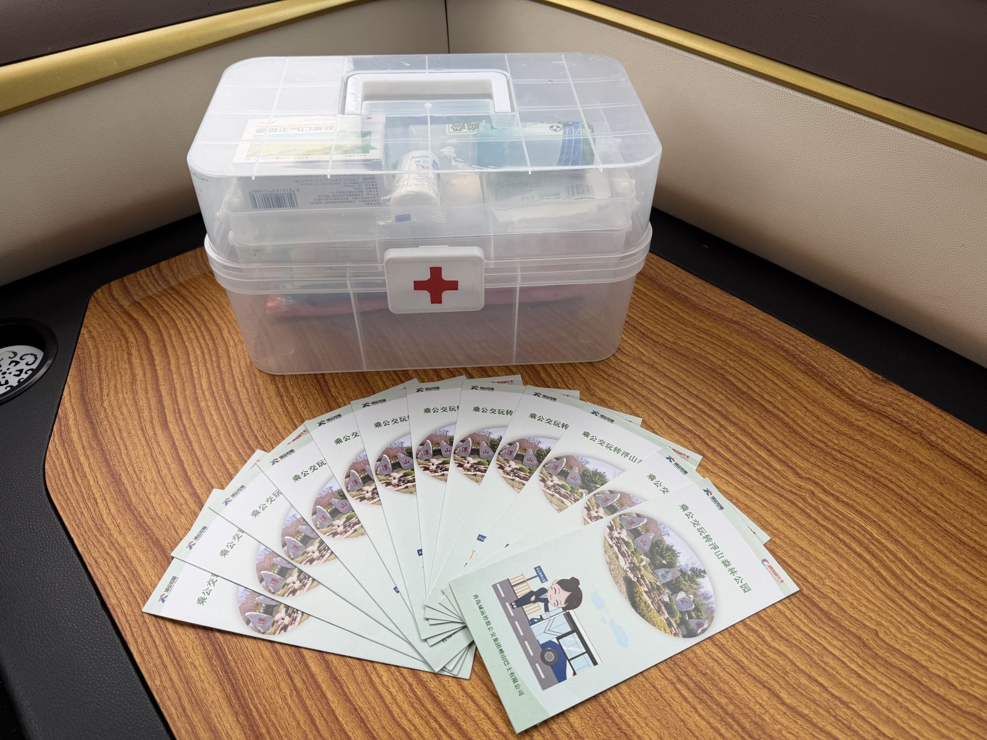 走进车厢,一个醒目的便民服务箱格外引人注目。打开箱子,里面整齐摆放着一次性雨衣、防滑鞋套——这是为应对山中突发天气而准备的贴心物件;藿香正气水、消毒棉片、晕车药等基础医药品一应俱全,以备乘客不时之需。这些物资由专线驾驶员定期检查、及时补充,确保每一件物品都处于可用状态。一个小小的服务箱,承载的是公交人对乘客安全与健康的无声守护。