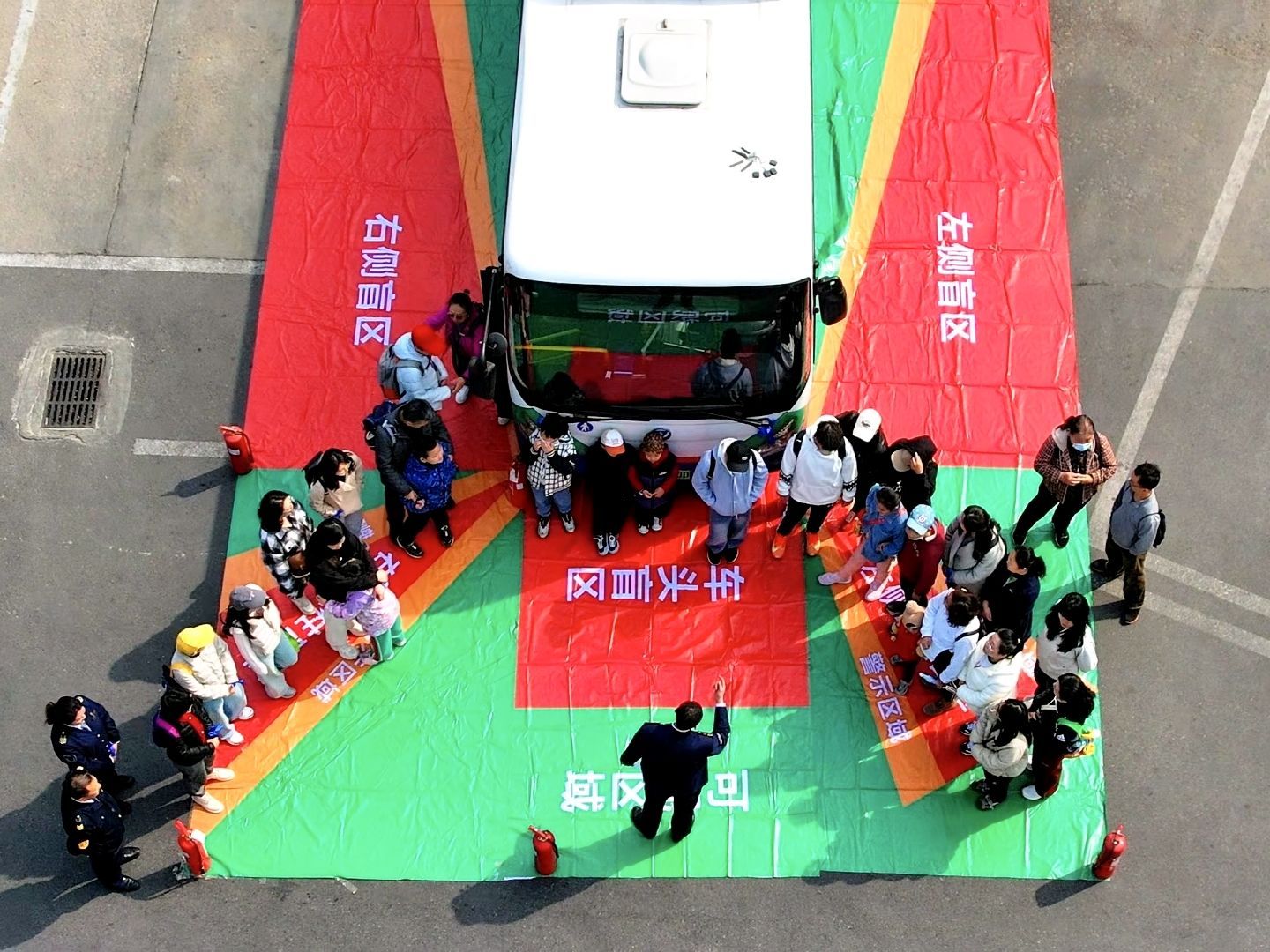 活动伊始,市南巴士三分公司安全员殷治华将一张特殊的“地垫”铺在公交车前。这是市南巴士自主设计制作的1:1车辆盲区示意地垫,完全按照公交车实际比例绘制,用醒目的颜色区分不同区域:绿色代表驾驶员可直接观察到的可视区域,红色则标识出车头、A柱、车身两侧等关键盲区。
