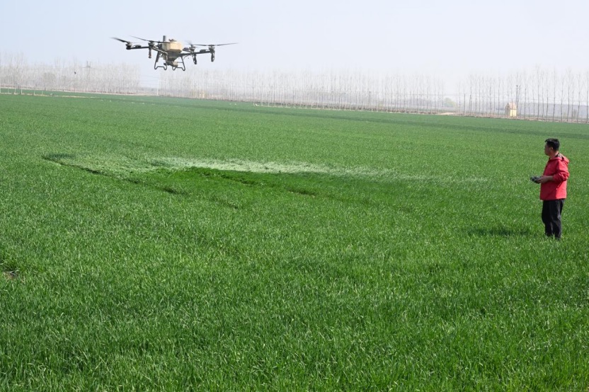 记者看到,胡君先的麦田里,植保无人机在离地约2米的低空进行飞防作业,向连片的小麦喷施叶面肥、除草剂等。“咱要想方设法降成本提收益。”胡君先告诉记者,他今年种植了1200亩小麦,除草、施肥全部用上植保无人机,2天就搞定,肥药洒得匀,还省钱。胡君先信心十足:“新技术加上合理密植、科学管理,丰收有底气!”