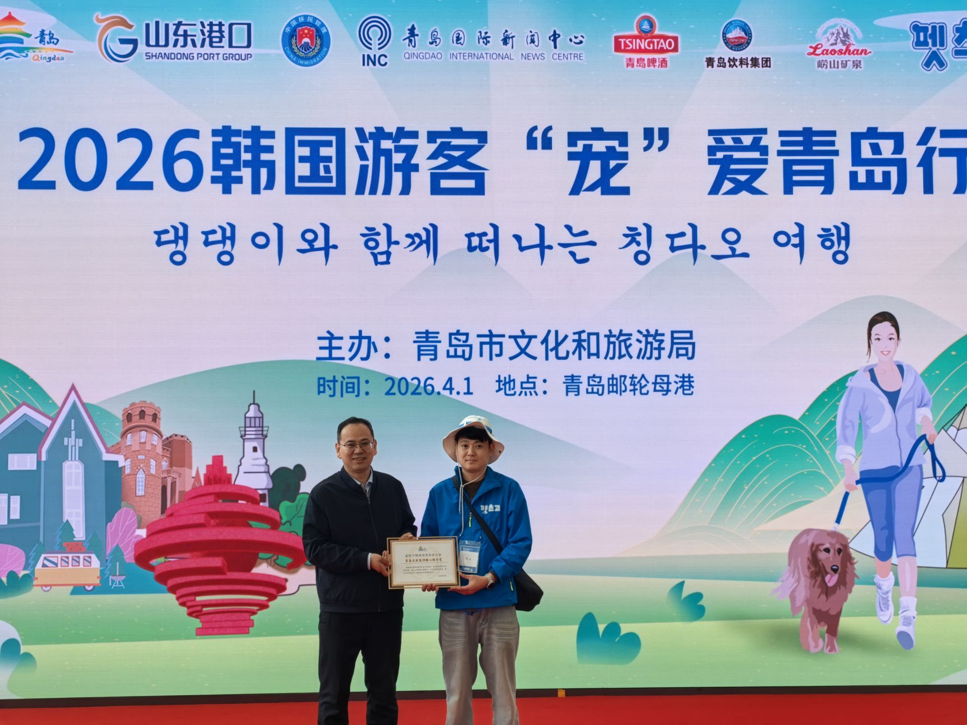 同时,青岛市文化和旅游局为韩国陪思狗旅行社颁发青岛文旅宠伴暖心推介官证书,充分依托境外文旅业界资源与社交传播优势,创新推行“以客荐客”精准引流模式,进一步扩大青岛宠物友好旅游在韩国市场的知名度与吸引力,持续拓宽境外客源渠道,为青岛入境旅游注入新活力。