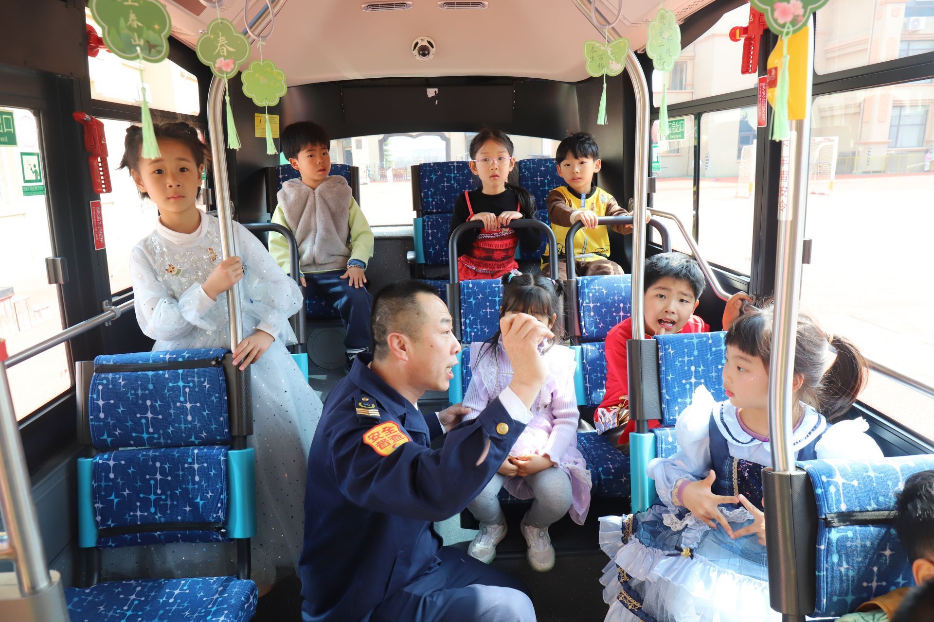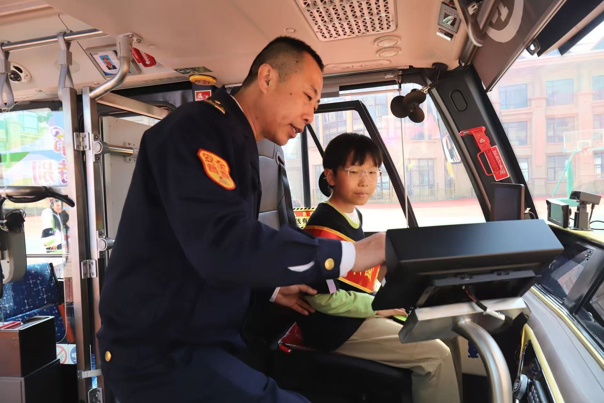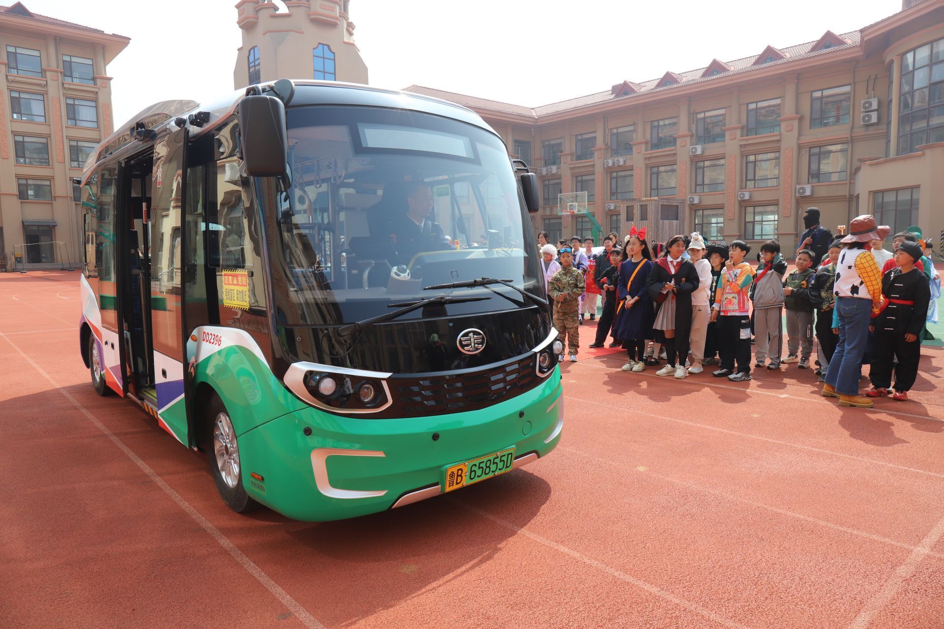 这辆仅有6米长的小型公交车刚驶入操场,便瞬间成为校园里的焦点。在师生们有序登车后,田言海开始为大家讲解车内设施,从驾驶室到车厢安全设备,从新能源公交车的环保特性到日常安全运营的细节,他都娓娓道来。他还结合自己多年的驾驶经验,用生动易懂的语言向孩子们普及公交出行安全知识。