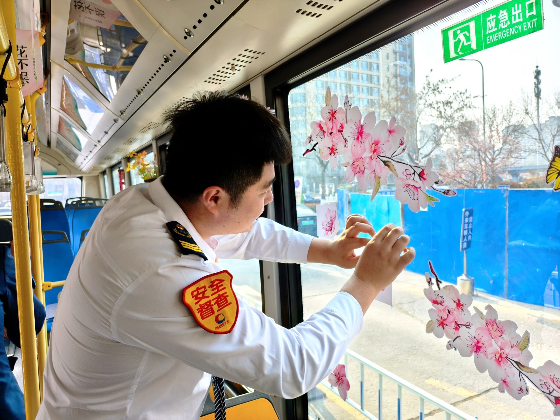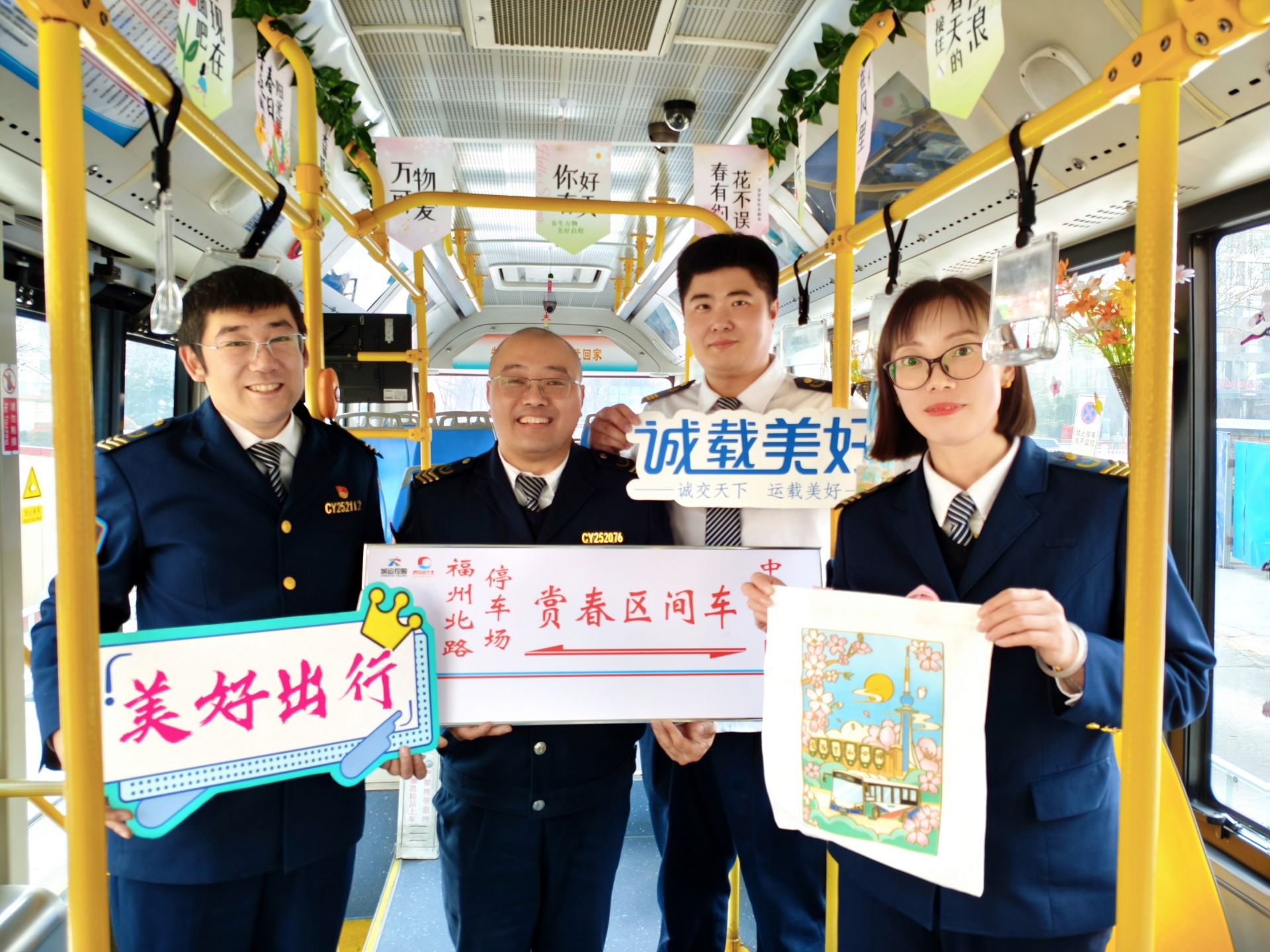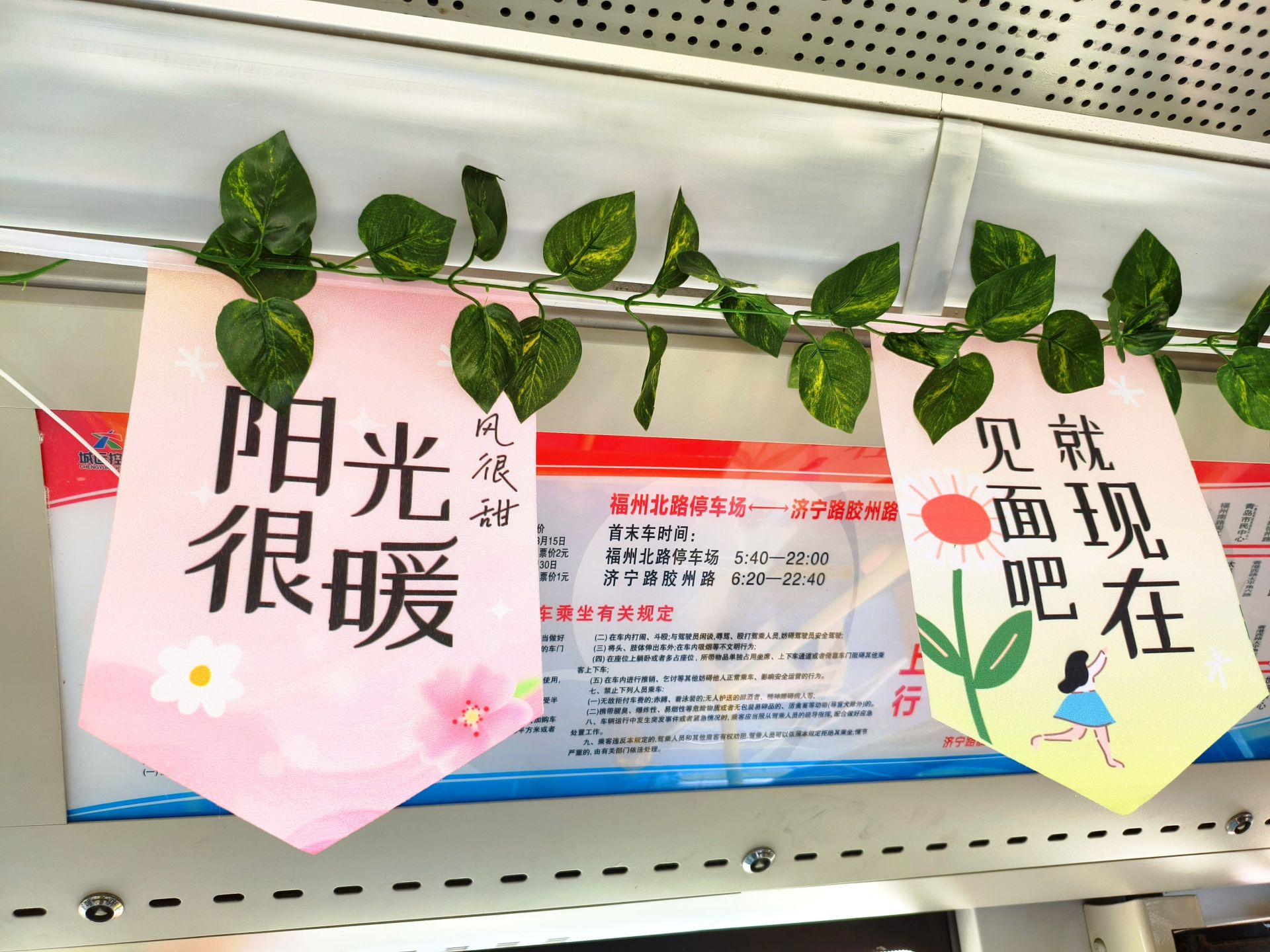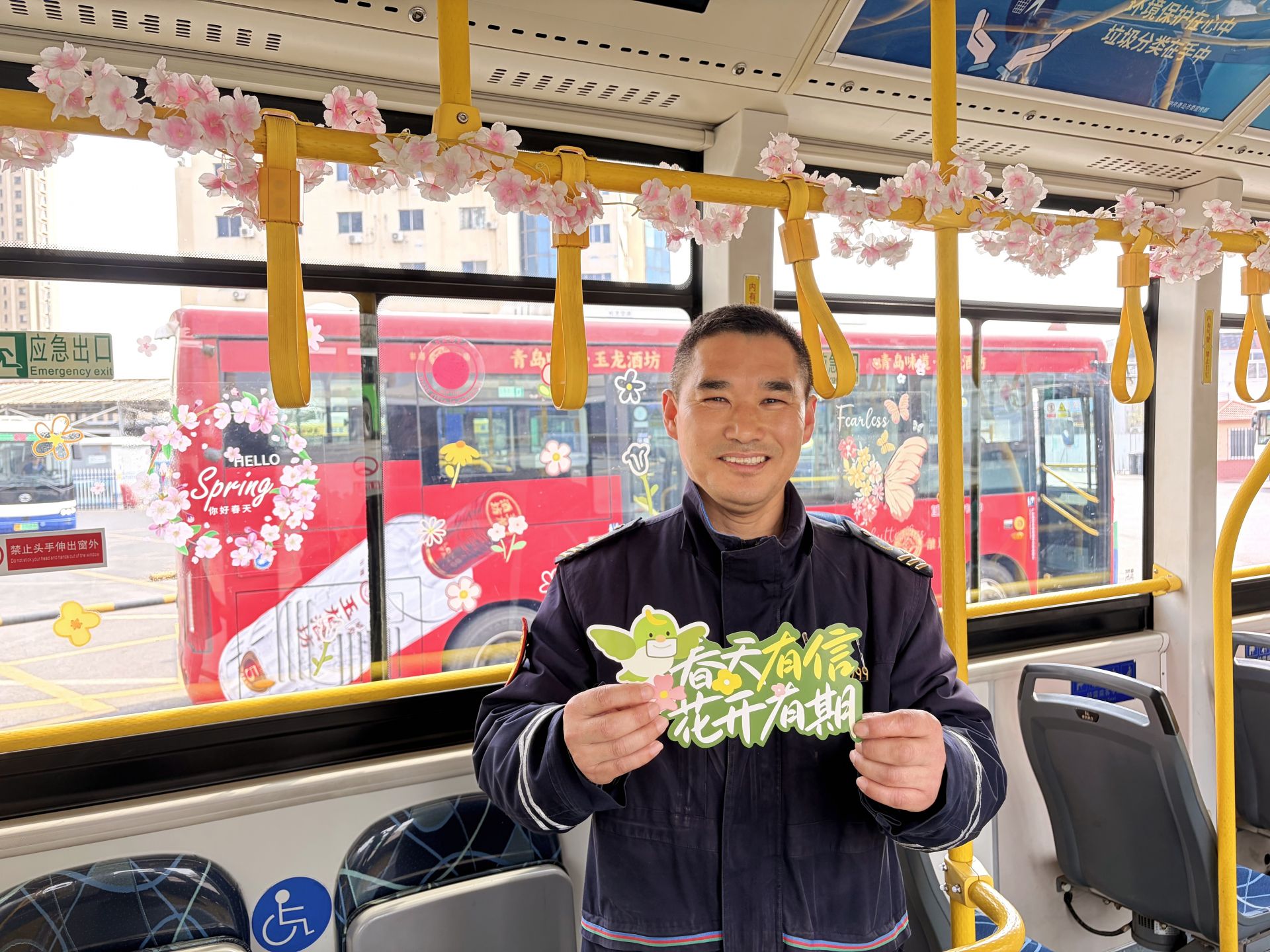 228路赏春区间充满春日巧思。市南巴士七分公司青年志愿者们精心挑选色彩鲜艳的鲜花贴纸及绿叶装饰,对车厢进行全方位布置,将户外的春日生机搬进十米车厢,让乘客在乘车途中感受春日暖意。