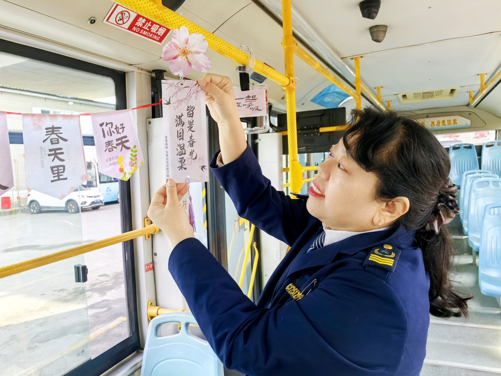为提升赏春出行体验,“青岛巴士”青年志愿者们对车厢进行了精心布置:车厢内张贴北岭山春日实景美图,扶手缠绕嫩绿仿真藤蔓,车窗点缀花朵装饰,座椅靠背贴有温馨赏春提示语。同时,志愿者还制作了赏花攻略卡片,详细标注公园内最佳赏花点位、步行路线及踏青小贴士,为乘客提供全程指引。