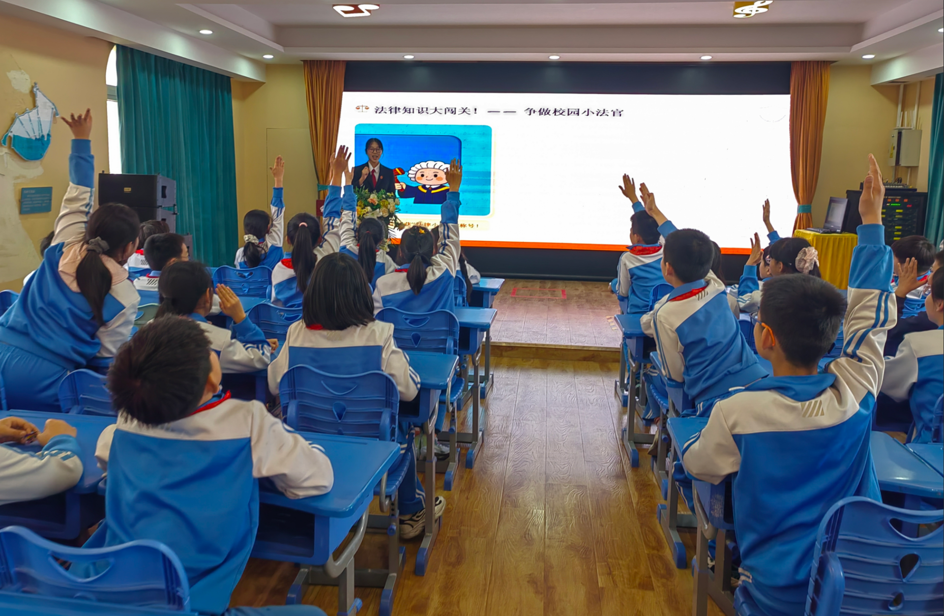 本次宣讲以“给成长穿上‘法律铠甲’——现实与网络世界的规则之旅”为主题。在《现实世界篇》,李沧法院干警结合相关法律法规,通过虚拟人物小宇遭遇欺凌的系列场景,用浅显易懂的语言讲解了校园欺凌的表现形式及法律后果,并结合校园内经常发生的案例,讲解了未成年人侵权的民事责任。《网络世界篇》则聚焦网络诈骗、网络谣言、网络隐私保护等方面,详细剖析了网络诈骗套路及网上泄露隐私、传播谣言的后果。现场还设置了法律知识大闯关、情景剧场等互动环节,充分调动孩子们主动思考、踊跃答题的积极性,让大家在轻松愉快的氛围中学会分辨危险、保护自己,深刻认识到遵守法律和规则的重要性。