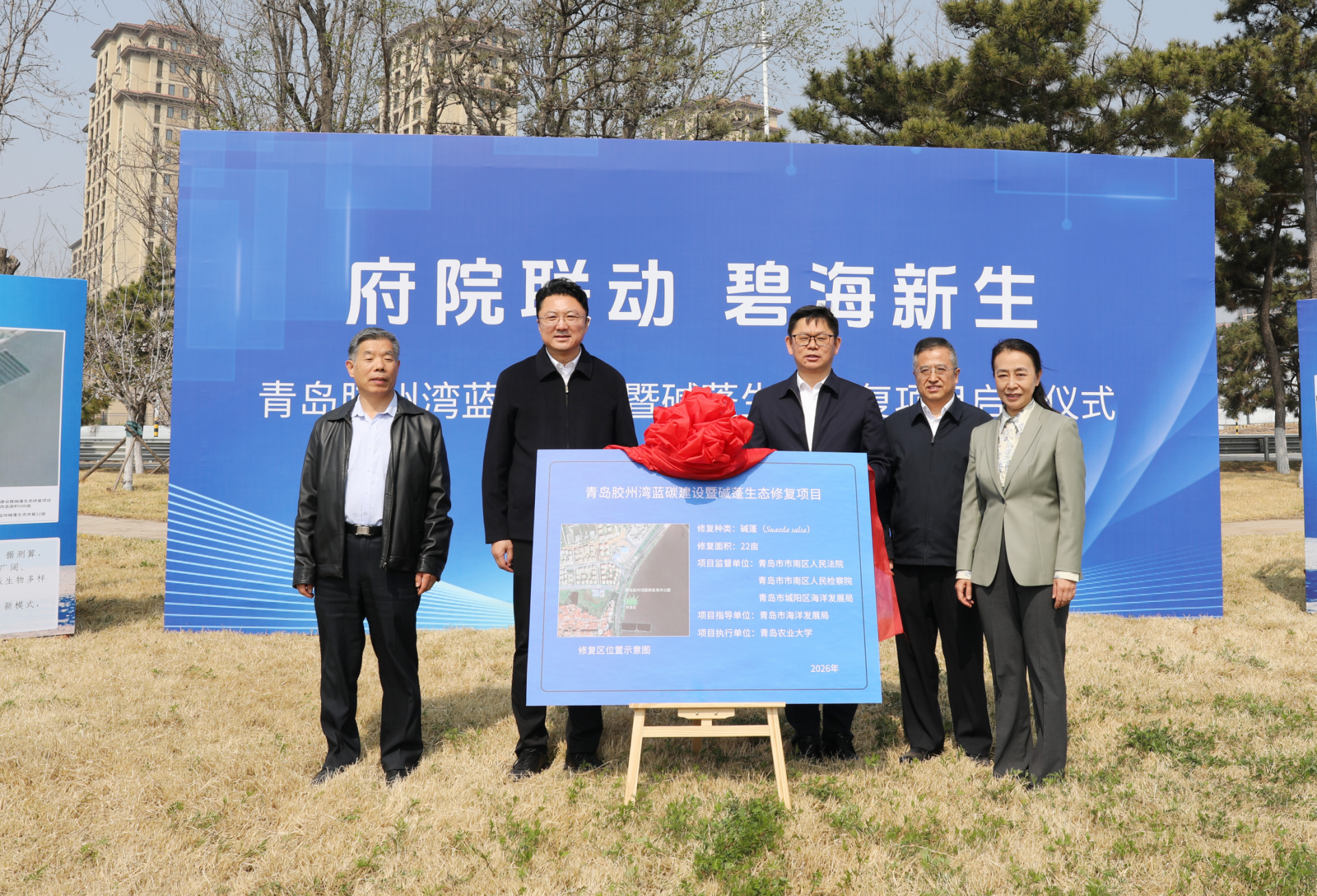 当天,城阳区政府副区长王成君,市南法院党组书记、院长肖政,市南区检察院党组书记、检察长于仲君,青岛市海洋发展局一级调研员王子江,青岛农业大学副校长孙庆杰共同为胶州湾蓝碳建设暨碱蓬生态修复项目揭牌,并前往修复现场,实地查看碱蓬幼苗生长情况。青岛农业大学技术团队现场汇报了碱蓬种植方案、生长监测计划与管护措施,市南法院、市南区检察院、城阳区海洋发展局等将对后续管护进行全程监督,确保修复工作落地落实、科学透明。
