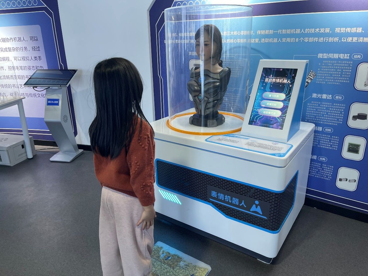 参观完三楼基础学科展厅后,小记者在讲解老师的带领下前往四楼人工智能展厅,这里集中展示各类智能机器人展品,涵盖舞蹈表演、智能分拣、动作模仿、书法创作、AI交互等多个板块,全面呈现前沿科技成果,是场馆科技含量最高、互动体验最强的特色展区。