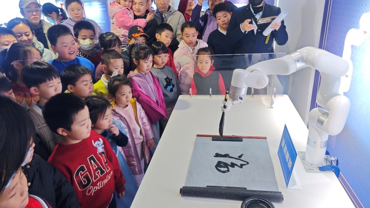 展厅一隅的书法机器人以独特的东方韵味成为亮点。它宛如一位儒雅的书法大师,启动后,机械臂平稳抬起,精准完成蘸墨、运笔、落笔等动作,写下的楷书工整端庄,行书气韵连贯、神韵兼备。讲解老师介绍,书法机器人不仅展现了高精度运动控制技术,更实现了科技与中华优秀传统文化的融合,让古老书法艺术在智能时代焕发新活力。小记者静静观看,文化自信与民族自豪感在心中悄然生长。