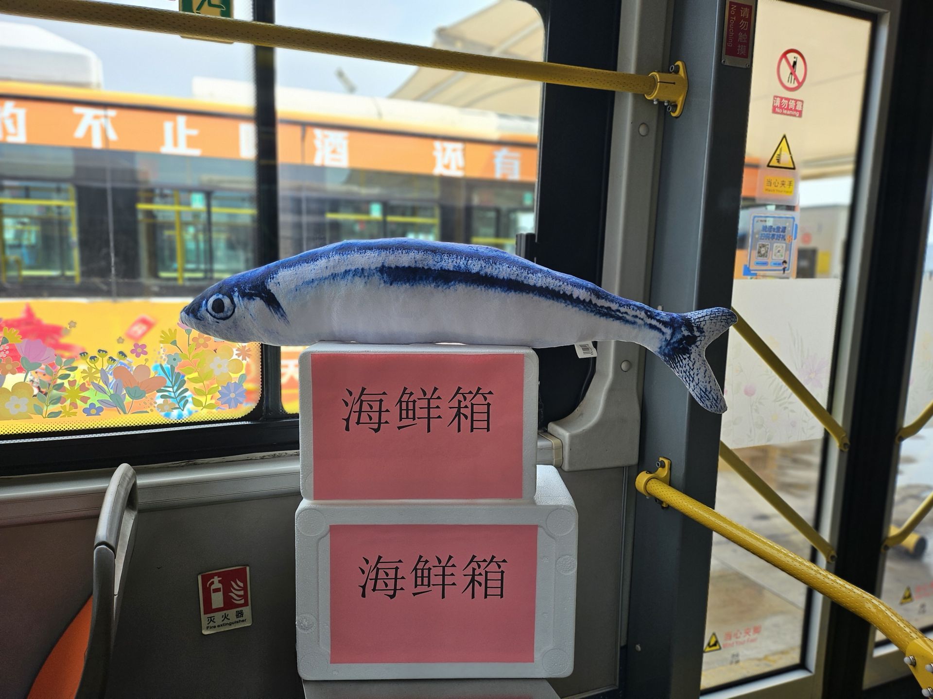 车厢中部,一处别出心裁的创意陈列格外引人注目:仿真鲅鱼造型玩偶憨态可掬,搭配标注“海鲜箱”字样的泡沫箱错落摆放,趣味还原了市民采购海鲜、走亲访友的鲜活场景。有乘客笑着说:“一上车还以为到了沙子口大集,那股子热闹劲儿一下子就出来了。”这种沉浸式的场景设计,让乘客在乘车途中便能感受到鲅鱼节独有的烟火气。