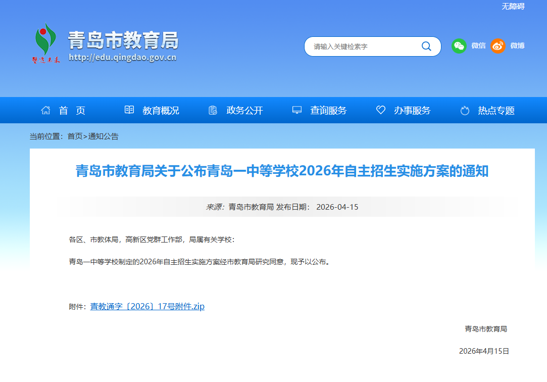 青岛一中等学校制定的2026年自主招生实施方案经市教育局研究同意,现予以公布。