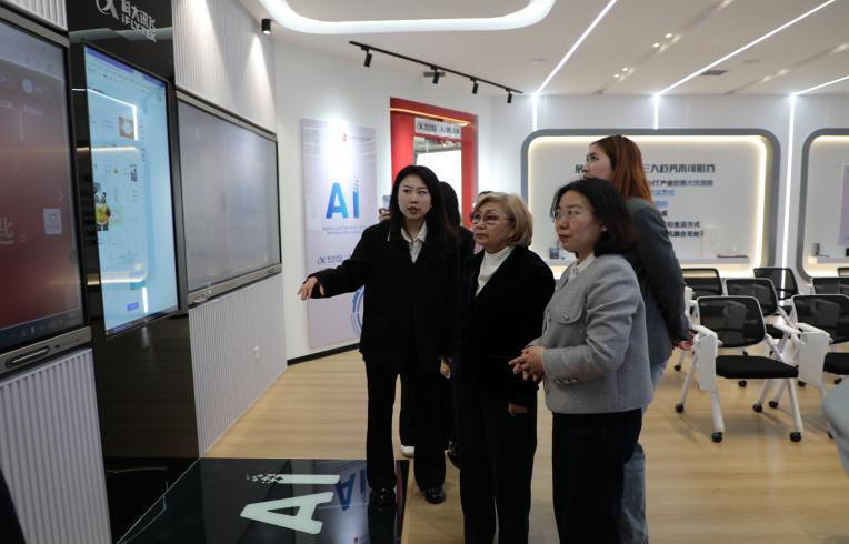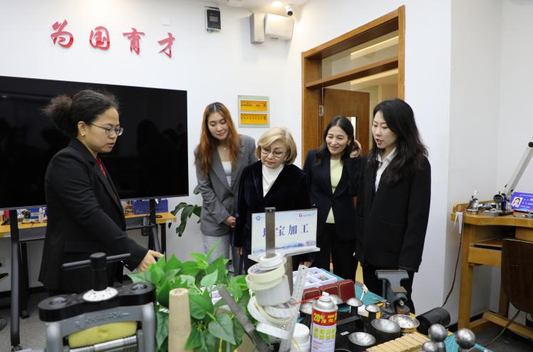 访问期间,哈方代表团先后走进学校学前教育实训室、信息网络中心、人工智能国际语言教育产业学院、珠宝生产性实训基地等场所,实地考察学校专业建设、实训条件与国际化办学成果,对学校现代化育人环境与特色化发展路径给予了高度评价。