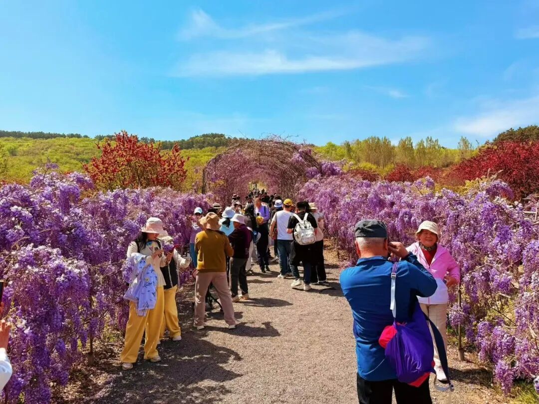 作为青岛近郊游热门目的地,也是此次活动举办所在的杨家山里乡村振兴片区,年接待游客超80万人次,文旅综合收入连年攀升。如今,非遗体验、红色研学、农事互动等多元内容,让片区乡村旅游的内涵更趋丰富立体:游客可亲手参与剪纸、陶艺、古法酿酒等老手艺制作,在指尖触摸乡村文化根脉;走进乡村红色遗址,聆听革命故事、传承红色基因,在休闲中汲取精神滋养;亲子家庭下地耕种、采摘果蔬、喂养家禽,在劳作中感受农耕乐趣;年轻群体则体验露营野餐、乡村市集、民俗展演等新潮玩法,收获独特休闲体验。作为片区热门景点之一,無比方花园种植500个品种、300万株花卉,杜鹃、紫藤交织成流动的花海,吸引不少市民游客驻足拍照,沉浸式感受乡村盛景。