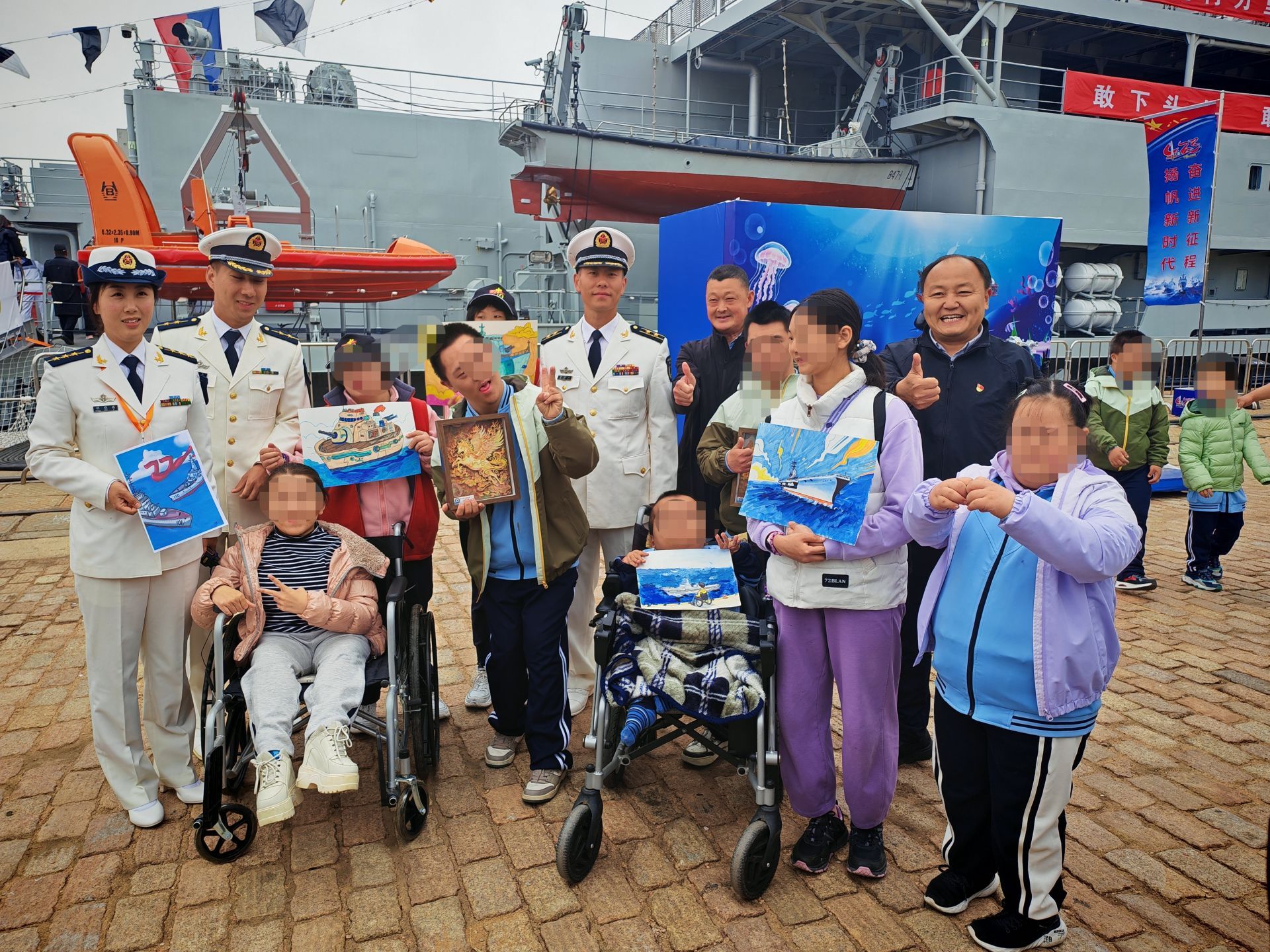 带着对蓝色的憧憬,孩子们小心翼翼地怀揣着自己精心绘制的海报,在工作人员和海军官兵的全程陪伴下有序登舰。