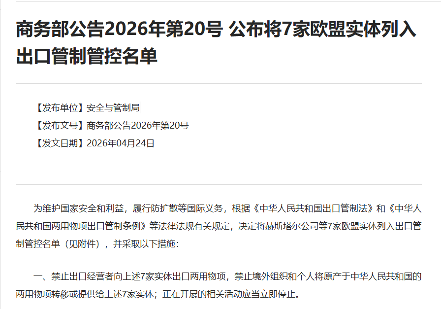 原标题:商务部公告2026年第20号 公布将7家欧盟实体列入出口管制管控名单