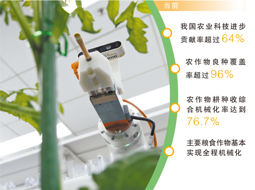 “十五五”规划纲要提出,强化农业科技和装备支撑。把农业建成现代化大产业,关键在科技进步和创新。当前,我国农业科技创新整体效能进一步提升,农业科技进步贡献率超过64%,农作物良种覆盖率超过96%,农作物耕种收综合机械化率达到76.7%,主要粮食作物基本实现全程机械化。各种智能装备在农业生产中大显身手,科技为现代农业插上了腾飞的翅膀。