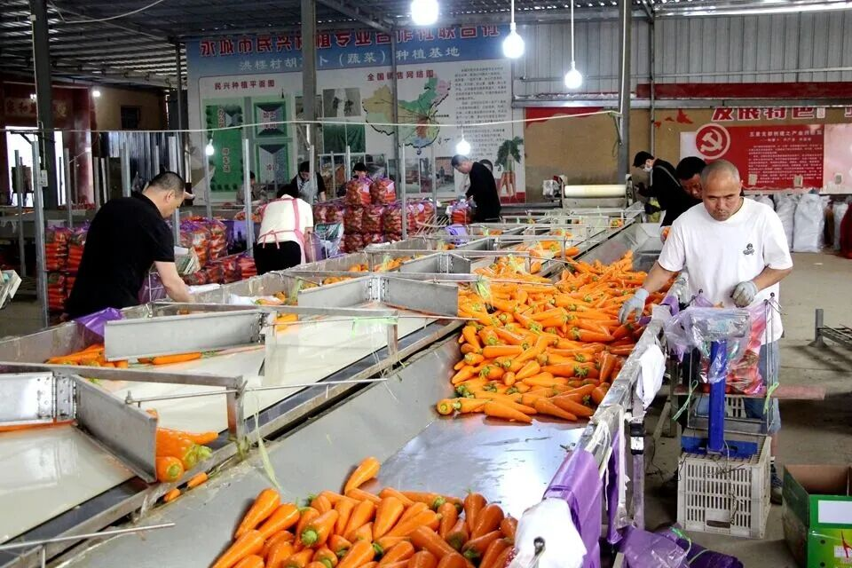 在民乐种植专业合作社清洗车间内,胡萝卜无损分拣流水线正在高效运转。图源:“永城融媒官V”微信公号
