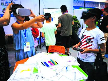 在大会开幕同时,国际互联网应用成果展览在会展中心举办。以 “互联网时代的教育变革与创新——大数据、云计算、混合式教育、个性化学习”为主题的展会展示了一个未来课堂的设想。在清华同方的展台前,参观者像学生一样坐在座位上,捧着平板电脑上课。学生学习情况、做题正确率随时上传,老师可以实时了解学生的学习进度。青岛智海云天则带来了“VR多维课堂”展示,在不到半年时间内,公司的这个技术已经走进全国近百所中小学,提高传统课堂的信息化程度,让课堂形式变得更加多样化,激发学生的参与度,提升教学效果。