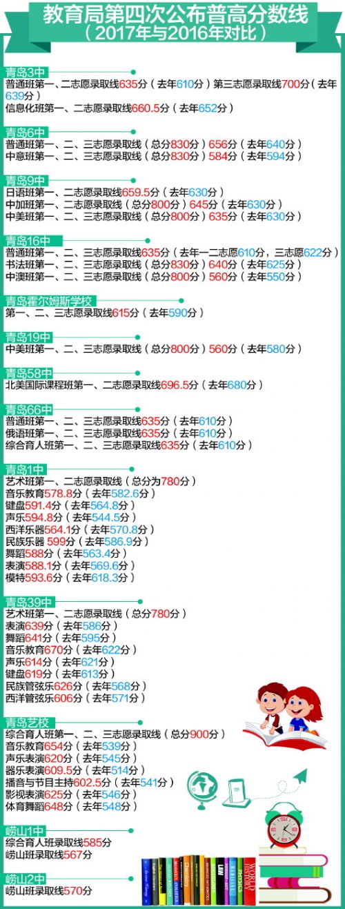 7月16日,市教育局第四次公布中考录取分数线的,这是普高的最后一次分数线。公布了青岛一中艺术班、青岛三中普通班、信息化班、青岛六中普通班、中意班、青岛九中日语班、中加班、中美班等录取分数线。与去年相对比,3中、16中和66中的普通班一二志愿分数线均为公办普高线,但3中的三志愿分数线高达700分。另外,国际班分数线上,58中的北美国际班分数直逼700分。艺术班录取分数线比去年有高有低。