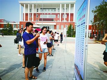 晚报讯 “你也在十九中!”“我在六班! ”昨天上午,高温下十九中新校区广场上学生和家长们的热情不比天气逊色。一进校门,科技楼前的广场上,十六个班的榜单排列在两侧,学生和家长兴奋地从头开始寻找自己的名字,看分在哪个班级。