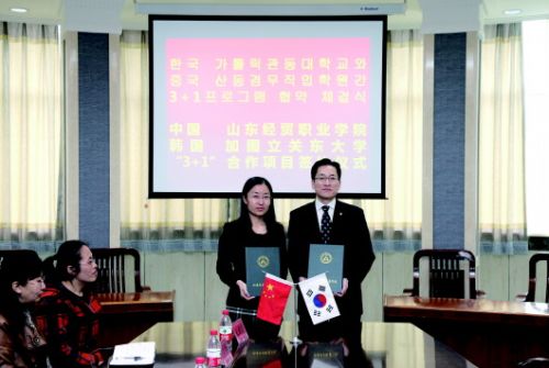 该院与韩国加图立关东大学于2007年建立好友学校关系,并保持着密切联系和合作,此前已通过“3+2”方式组织20多名学生赴加图立关东大学留学深造。其中1名学生获韩国政府颁发的“模范外国人奖”,研究生毕业后留校任教;1名学生进入研究生阶段学习,2名学生进入本科阶段学习。赴韩学生学习刻苦,成绩优异,均获得学费减半的奖励;1位学生通过自己的努力,留学期间获得“韩国政府奖学金”。