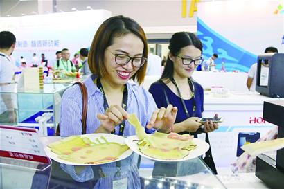 ■参加展会的两位女士观察3D打印的可食用煎饼。