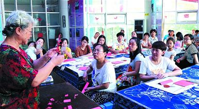 舞蹈班学生正在老师指导下练习舞蹈动作。徐常青 摄美术老师认真为学生讲解绘画知识。 陪孩子到文化宫上课的家长在剪纸大师李文玲指导下学习剪纸技术。