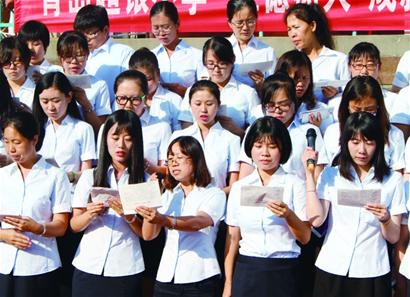 “忠于党的教育事业,贯彻国家教育方针……”昨日下午,青岛市新教师宣誓仪式暨优秀教师事迹报告会在青岛二中分校礼堂举行,来自市内三区、崂山区、局属单位及有关民办学校近600名中小学新任教师、青年教师代表面向国旗,庄严宣誓,郑重承诺履行教师职责,落实教师誓词。