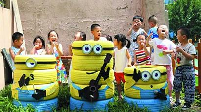 孩子们在户外混龄游戏中快乐成长。孩子们正专注地用废瓶子制作艺术品。